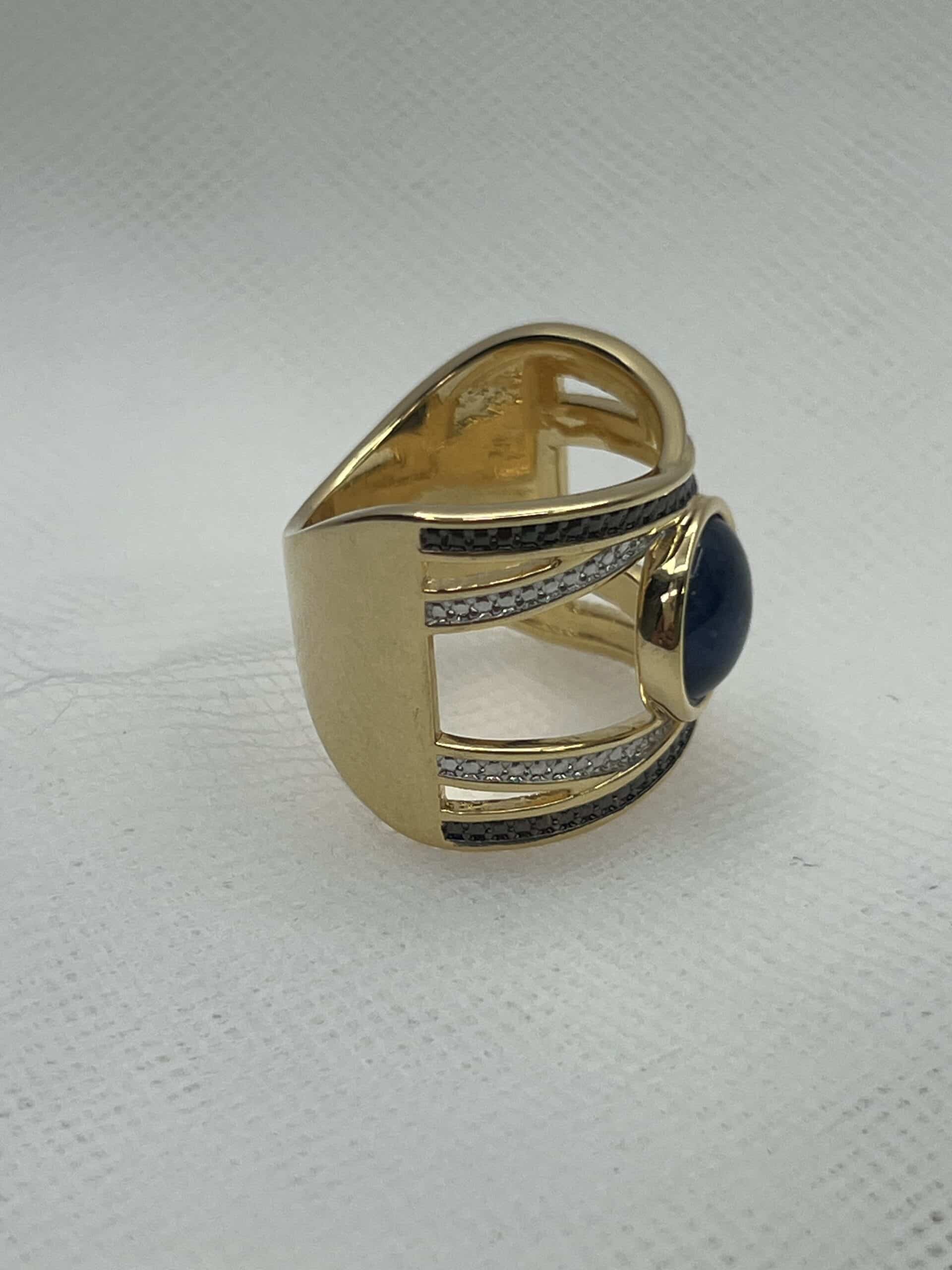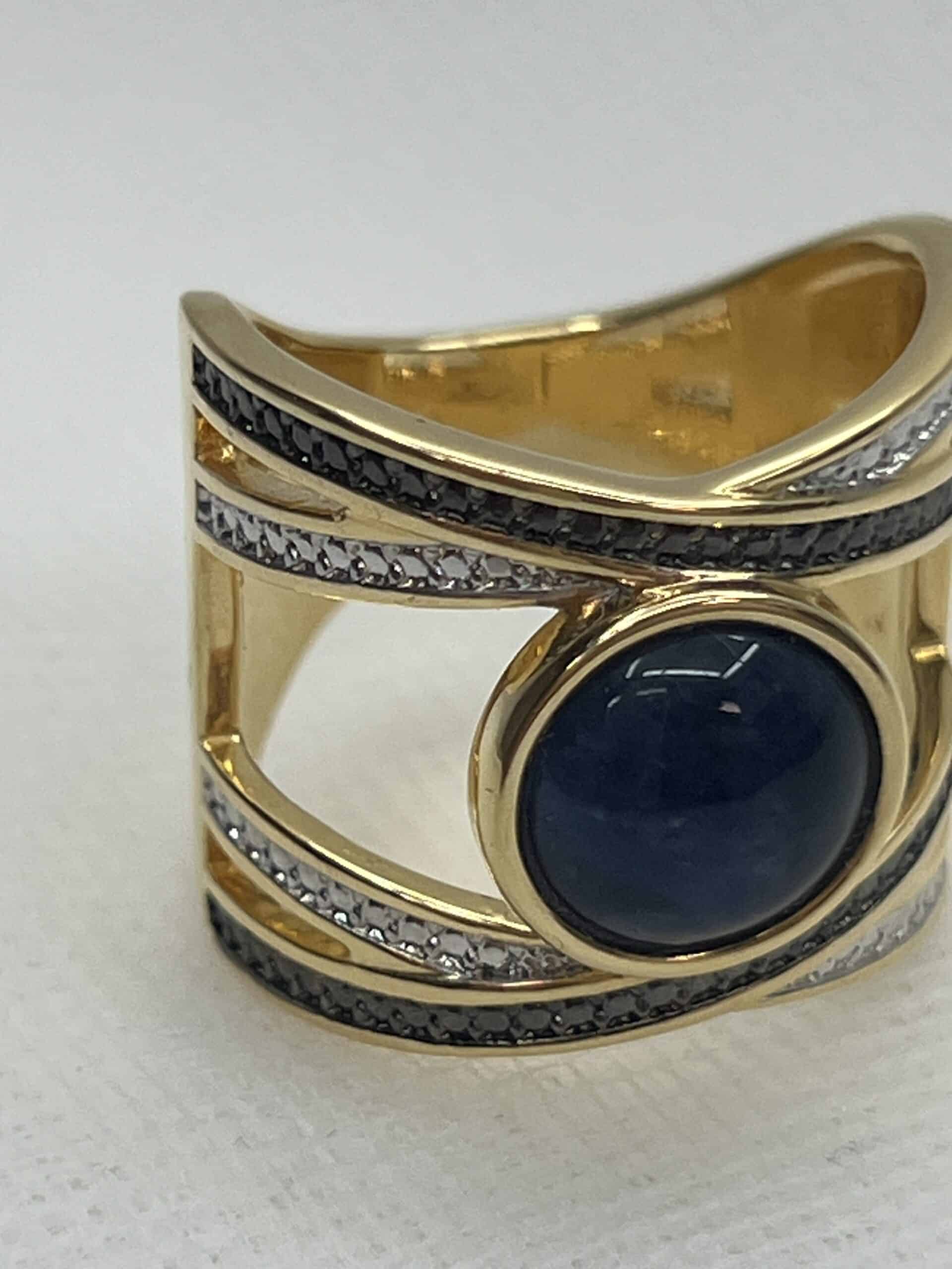 Anillo con circonitas blancas y negras y piedra central de sodalita.