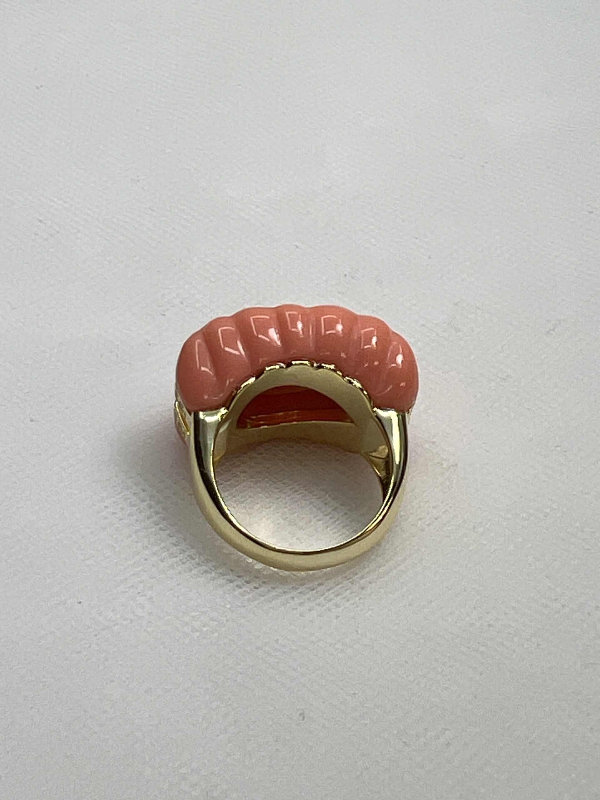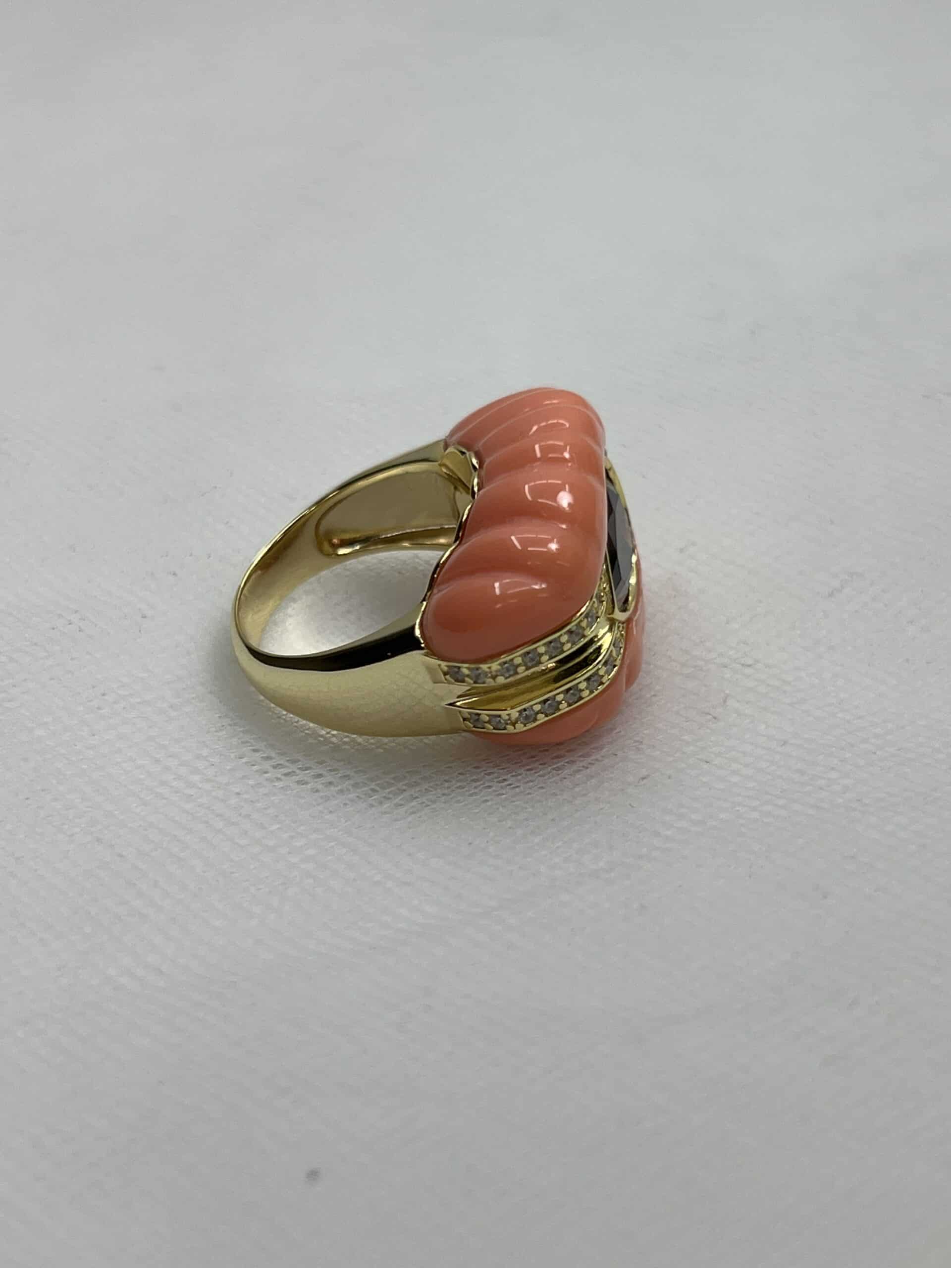 Anillo de plata chapado en oro amarillo sello de pasta de coral gallonado con circonita central granate y barra de circonitas blancas.