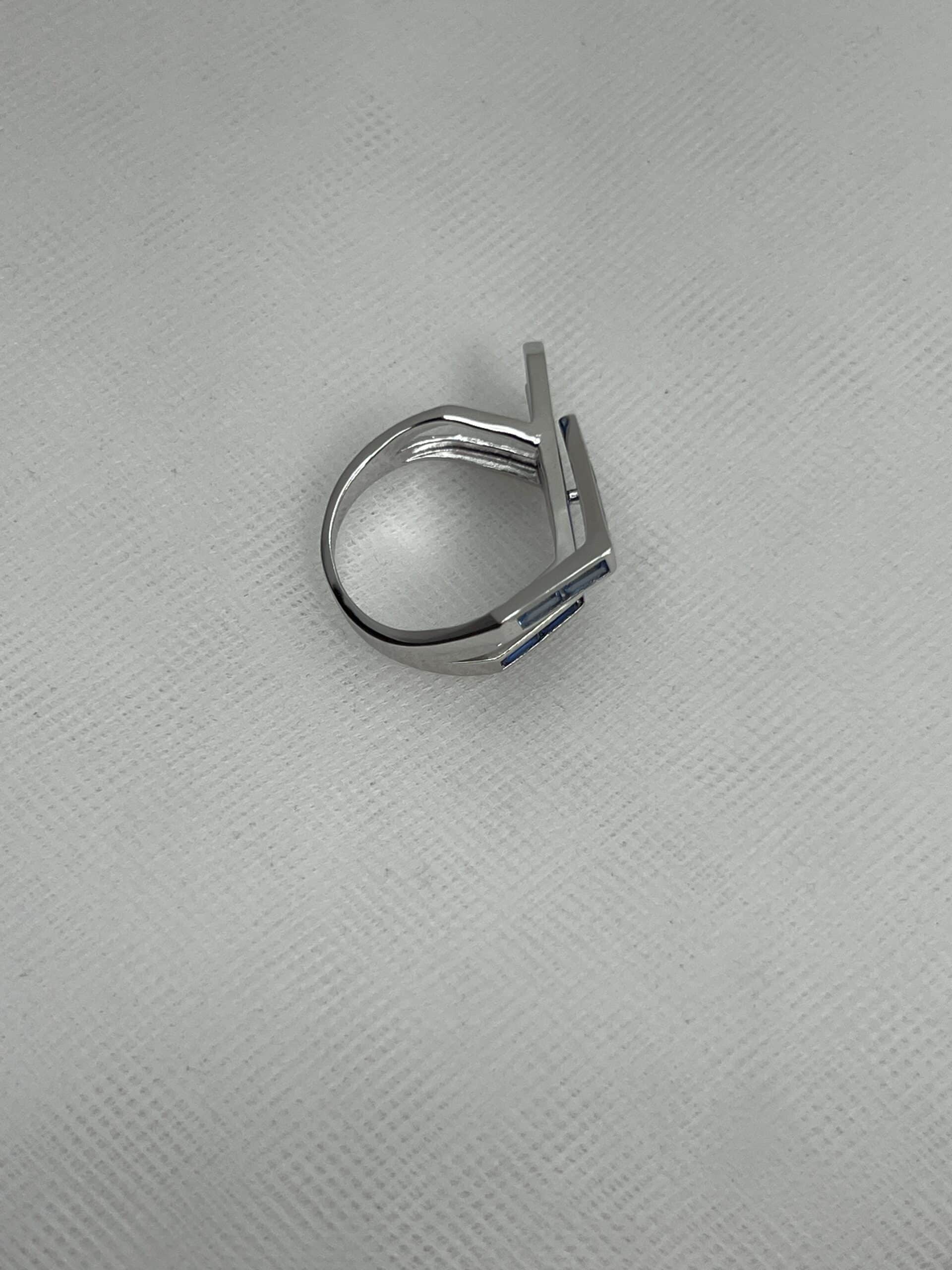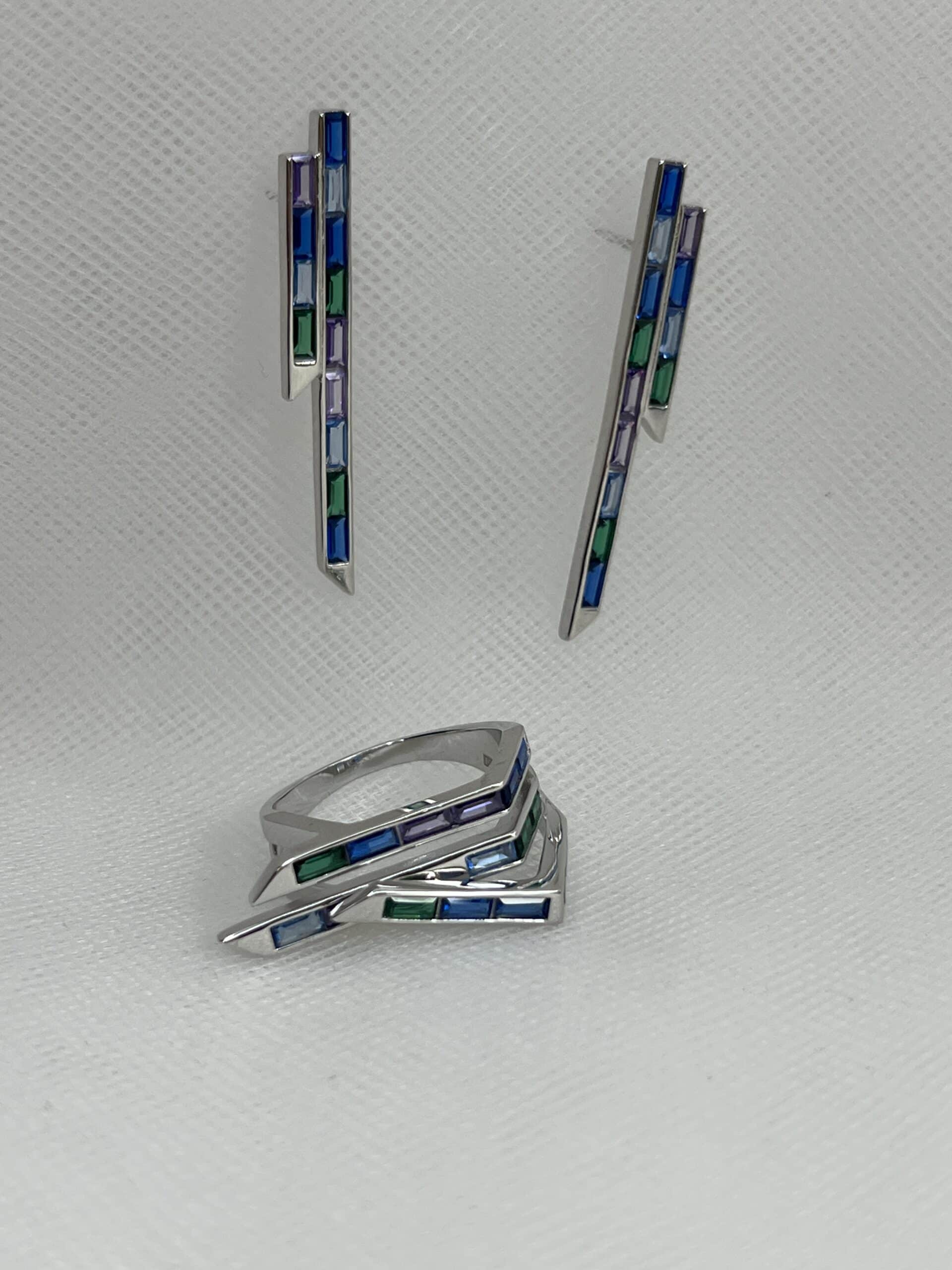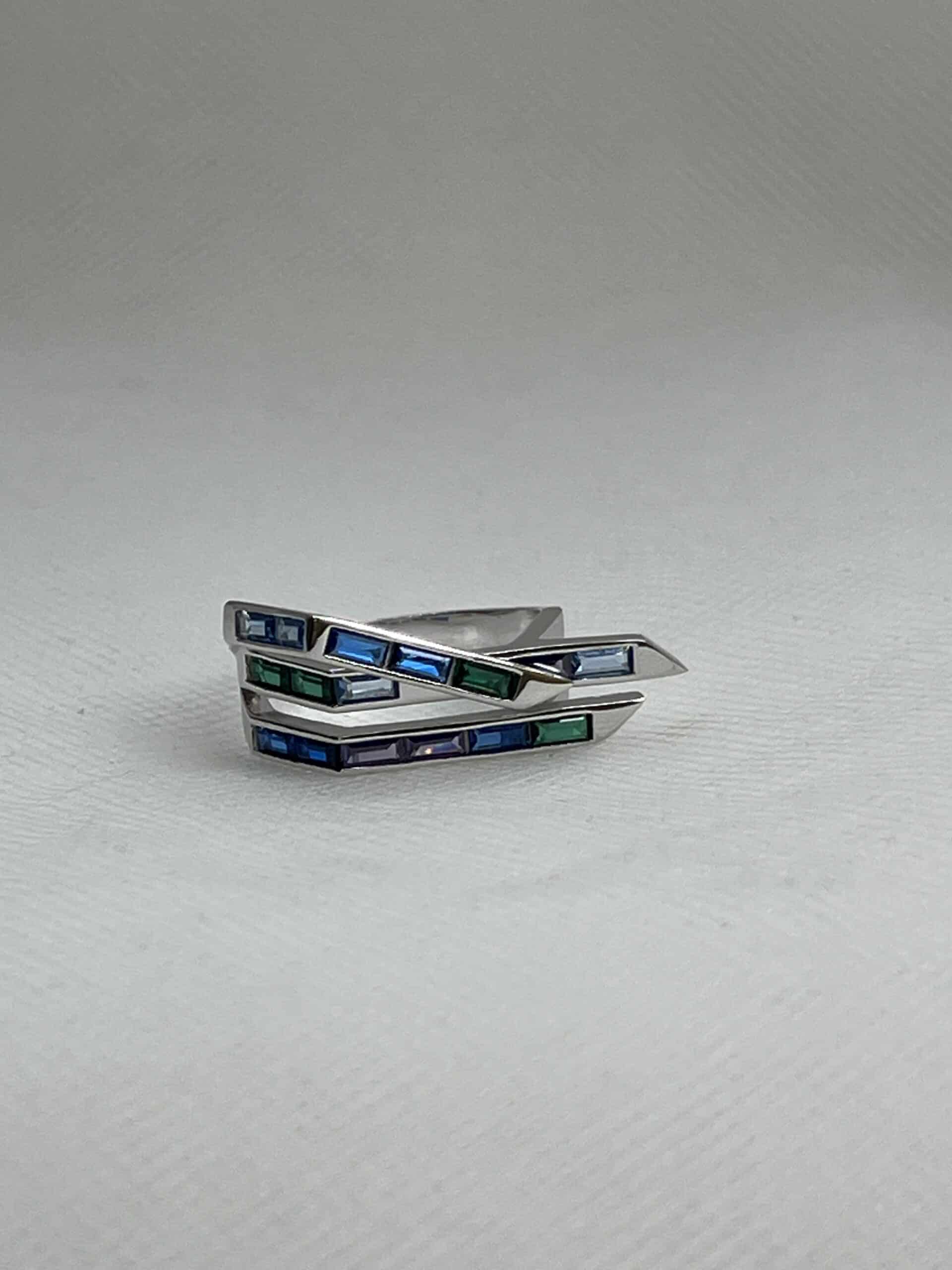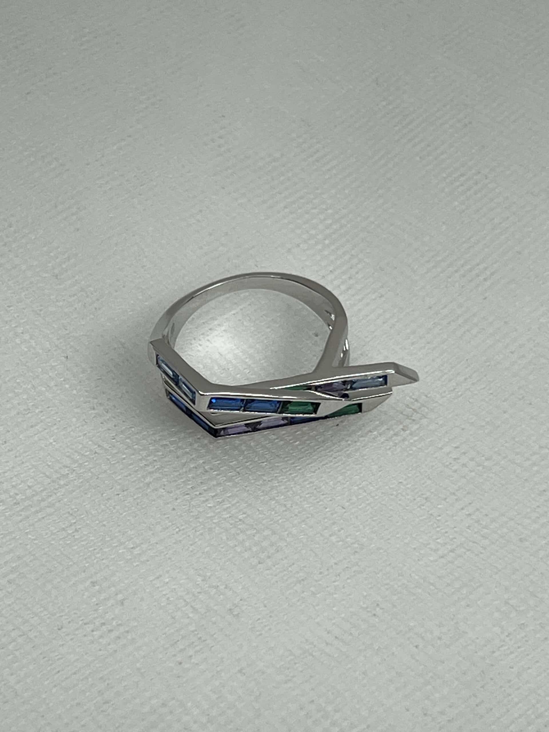 Anillo de plata rodiado en oro blanco con circonitas de distintos colores .