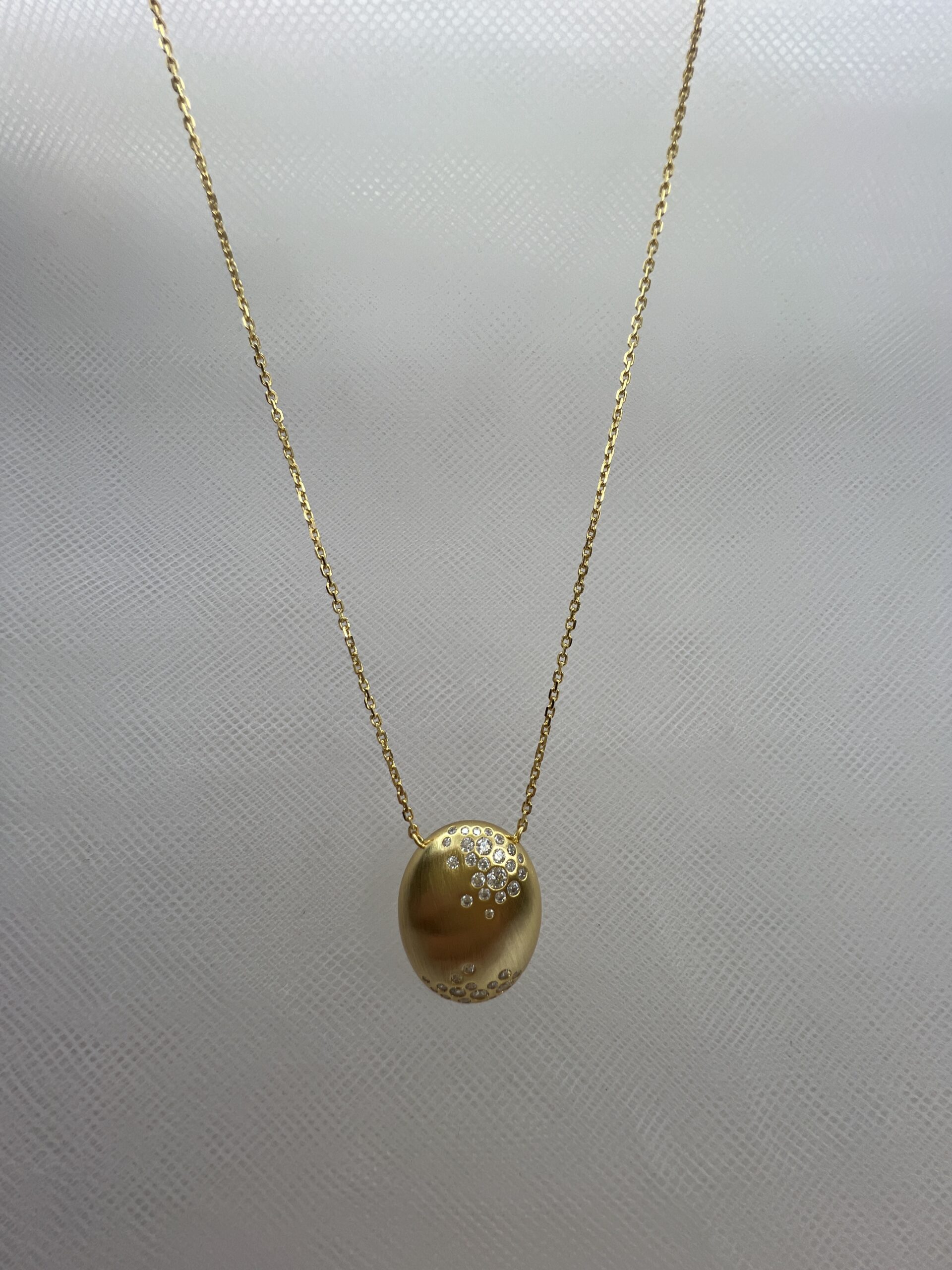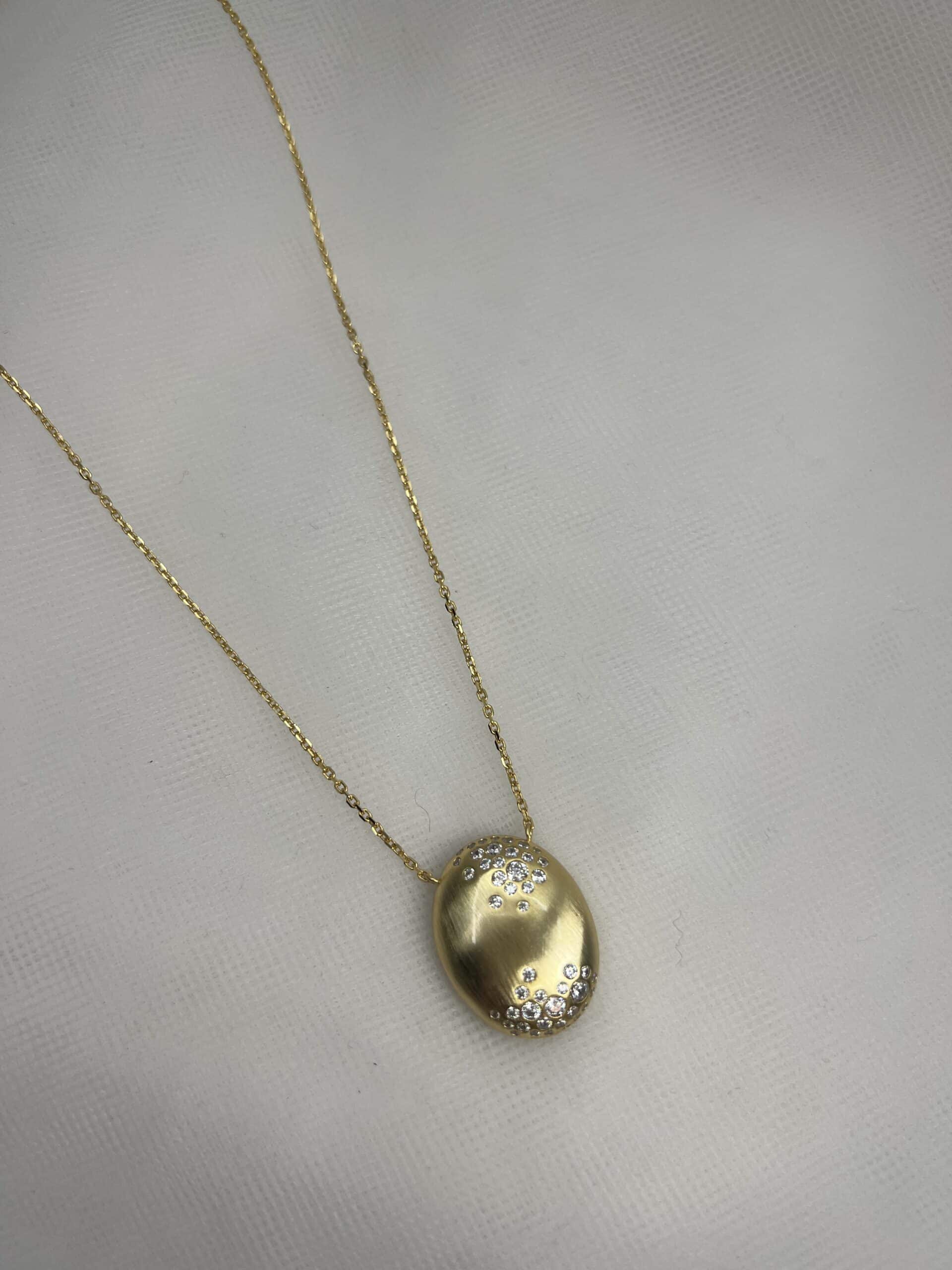 Sé el primero en valorar “Collar de plata chapada en oro amarillo cadena con colgante ovalado matizado con circonitas engastadas de distinto tamaño.”
