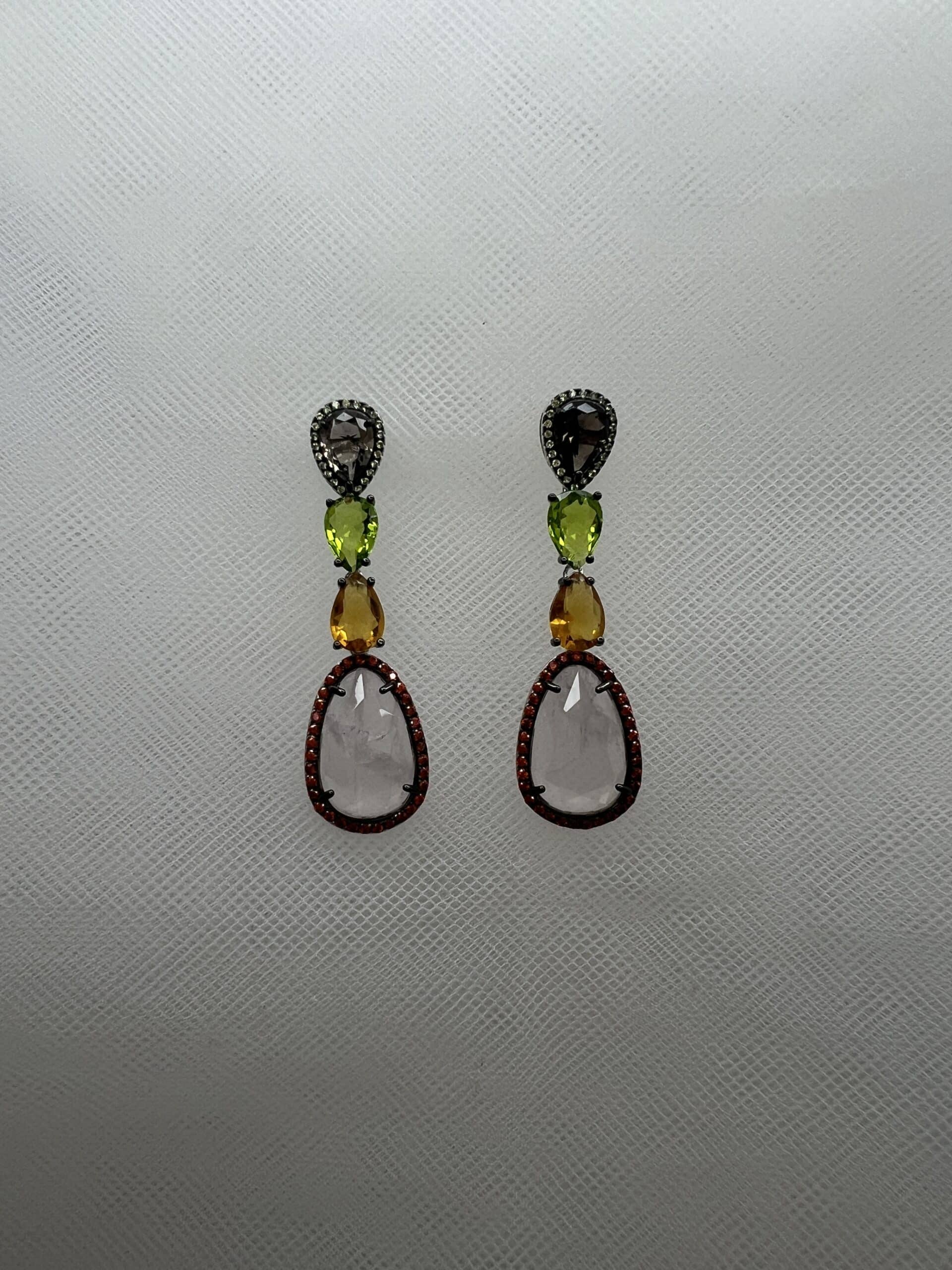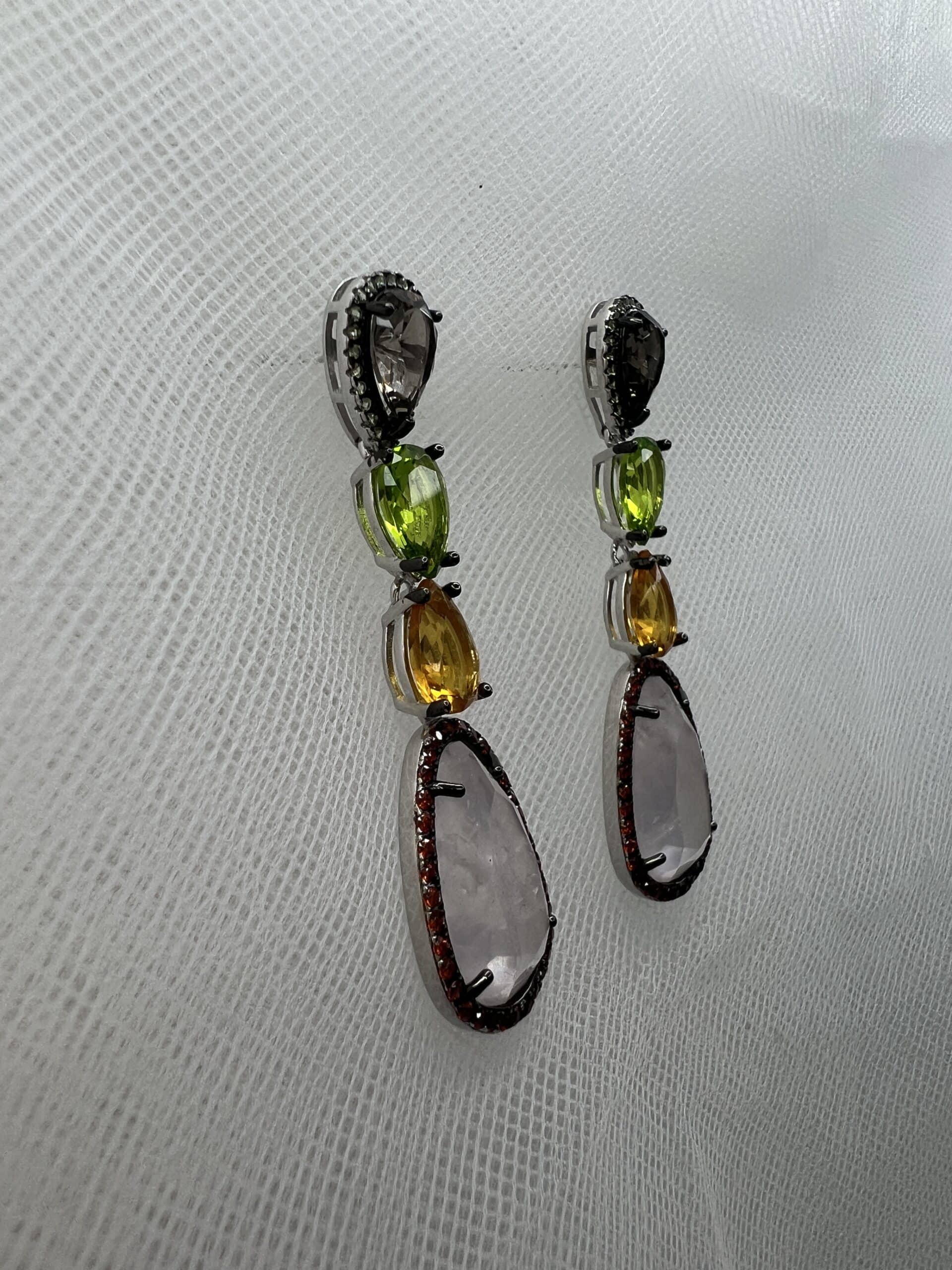 Pendientes de plata rodiada con circonitas de color y cuarzo rosa. La medida de largo es de 5.5 cm.
