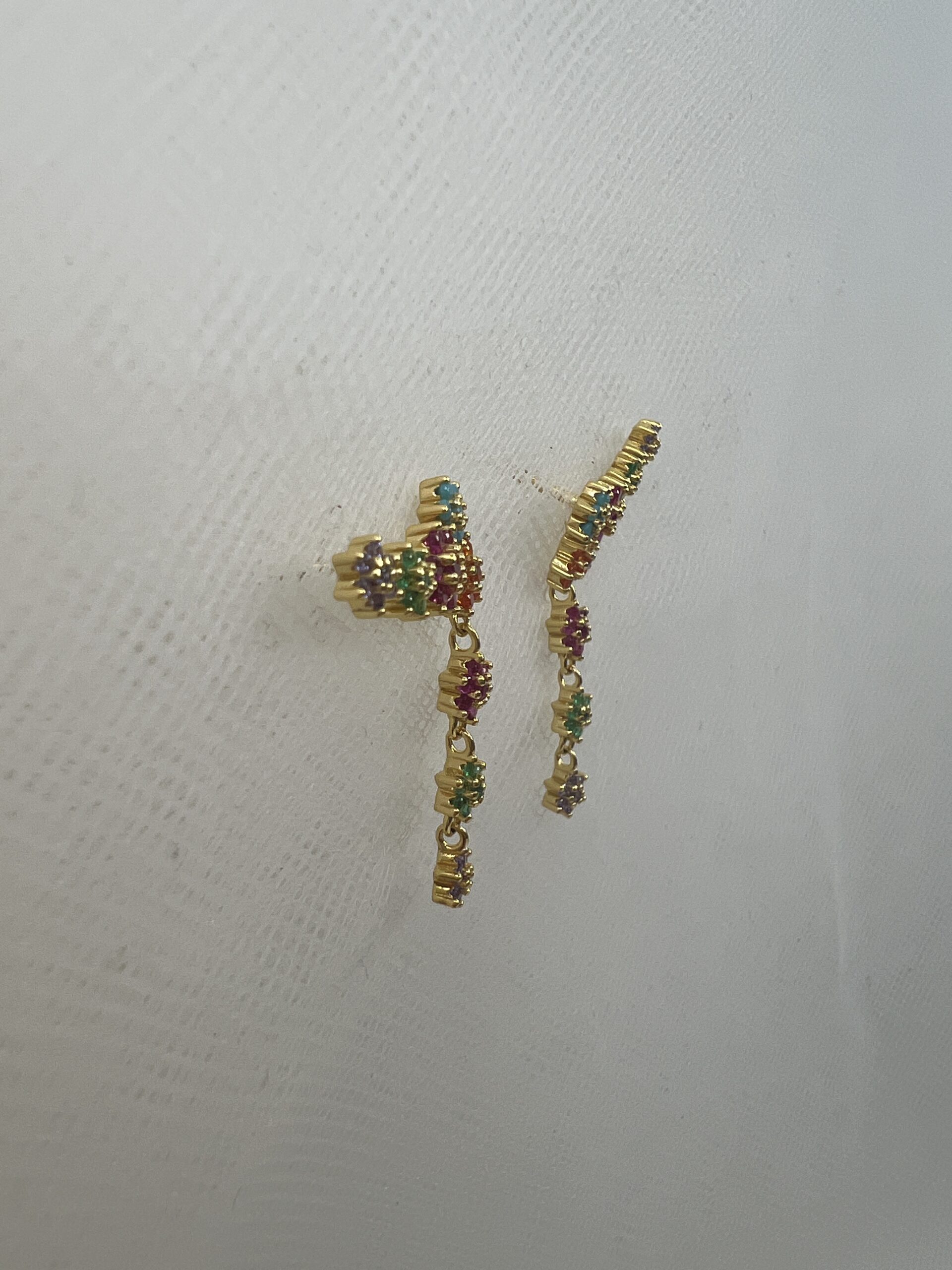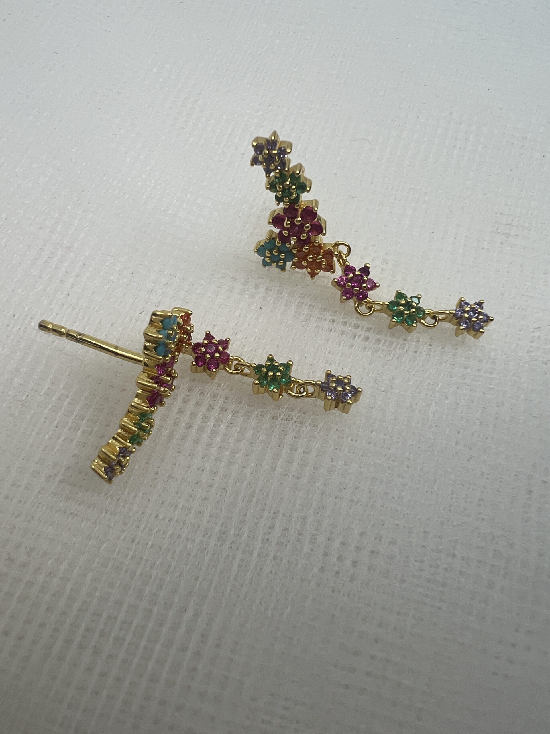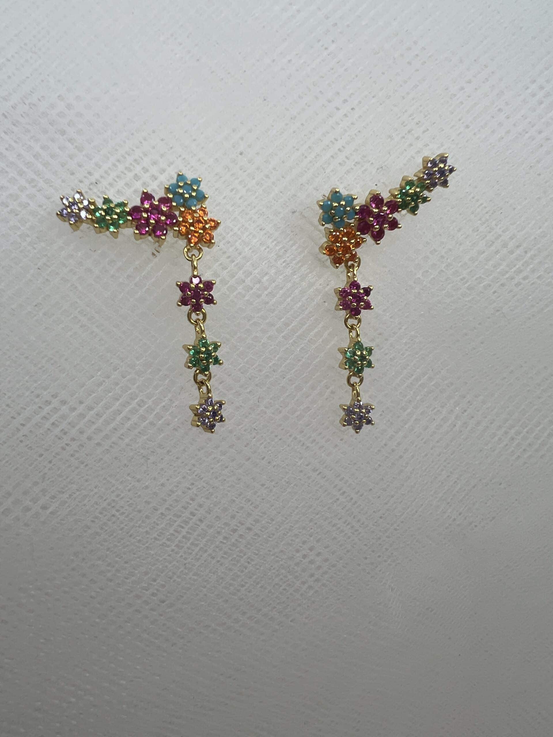 Pendientes trepadores de plata chapada en oro amarillo con circonitas de colores.