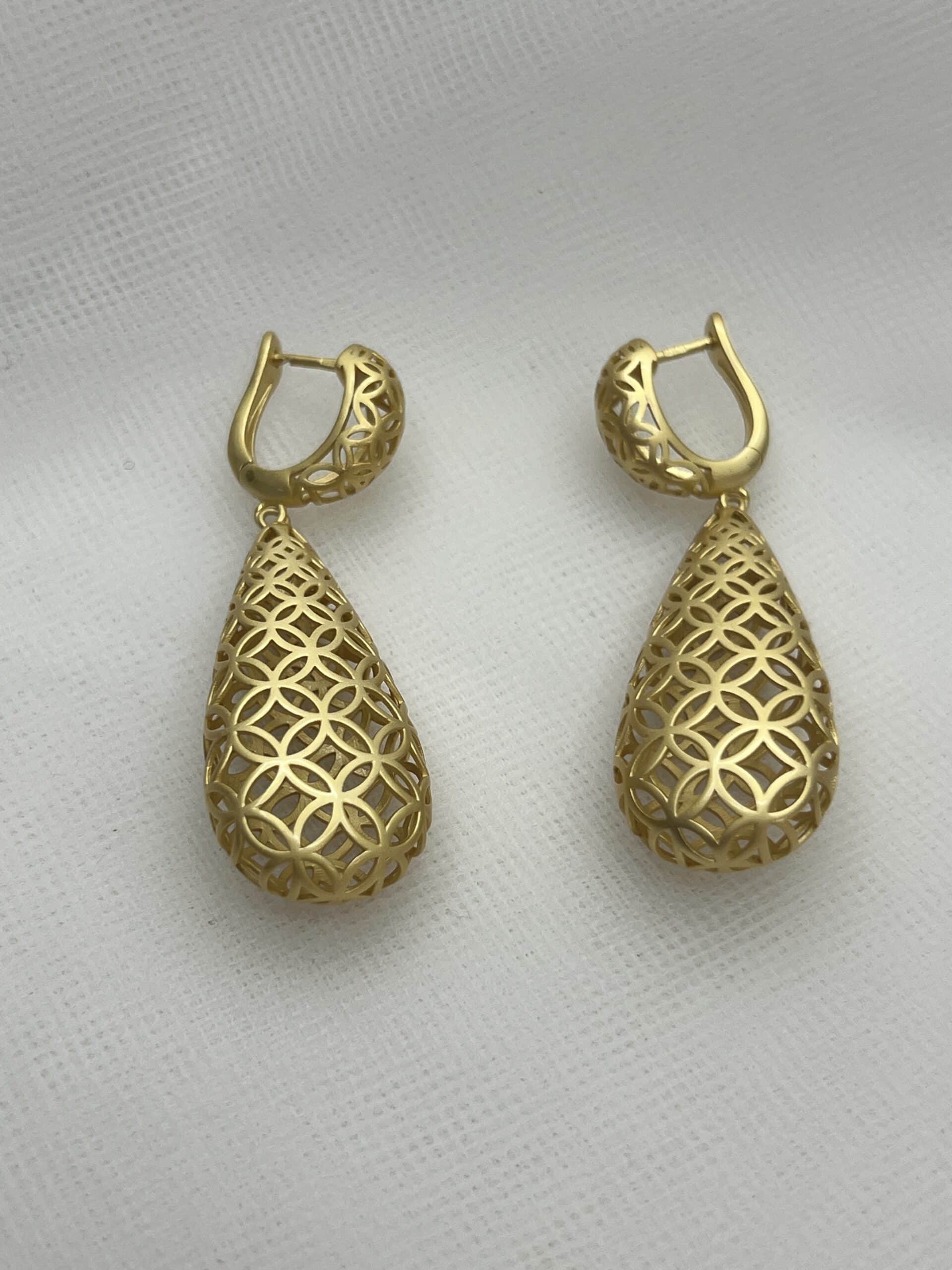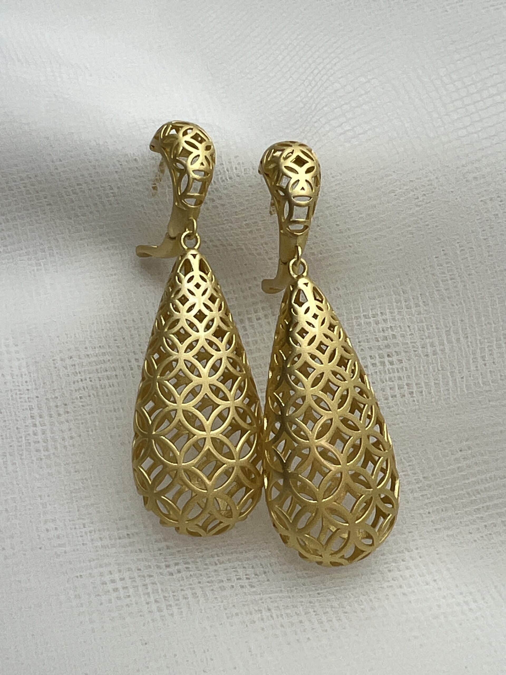 Pendientes de cierre catalan largos con forma de gota y calados con circulos entrelazados.