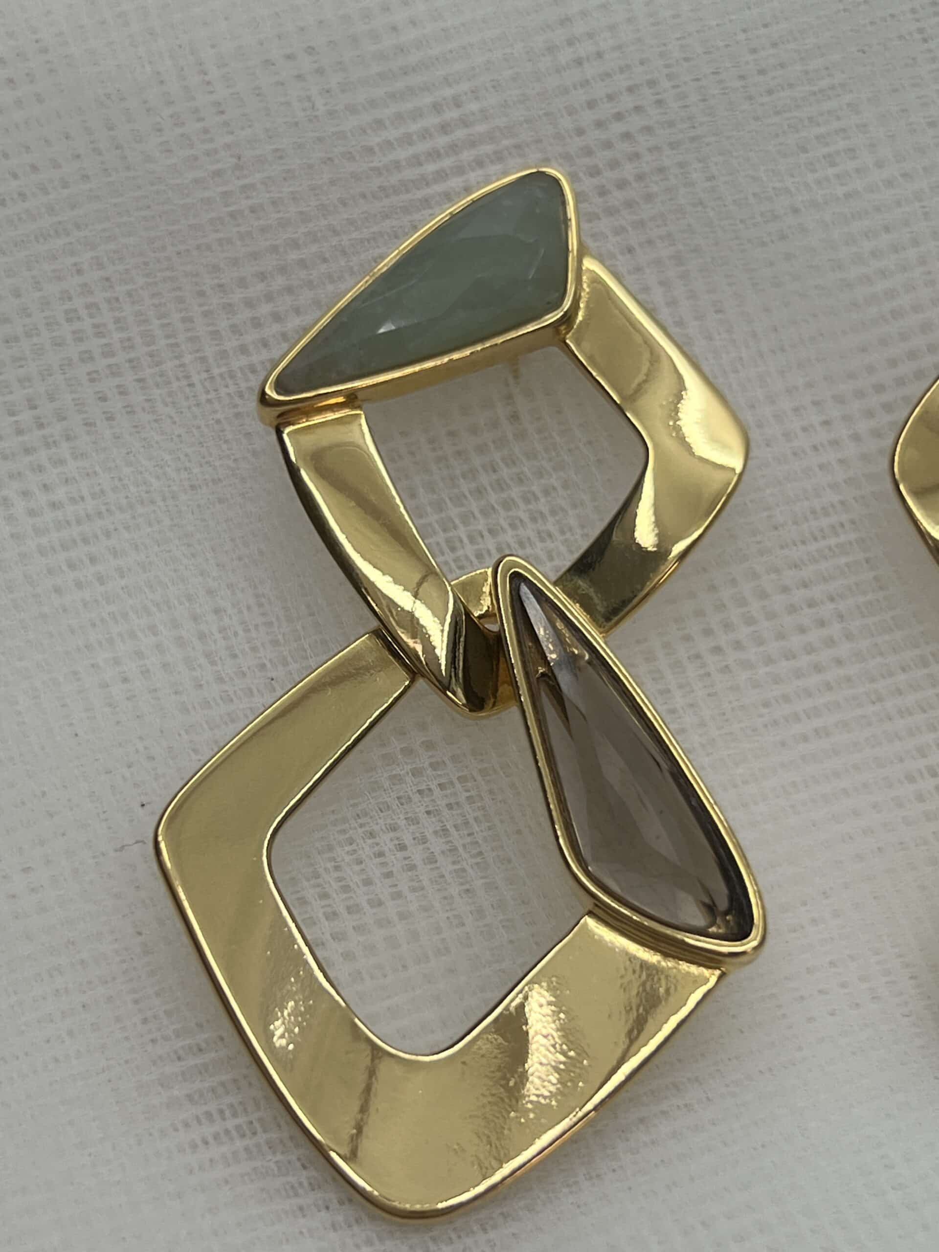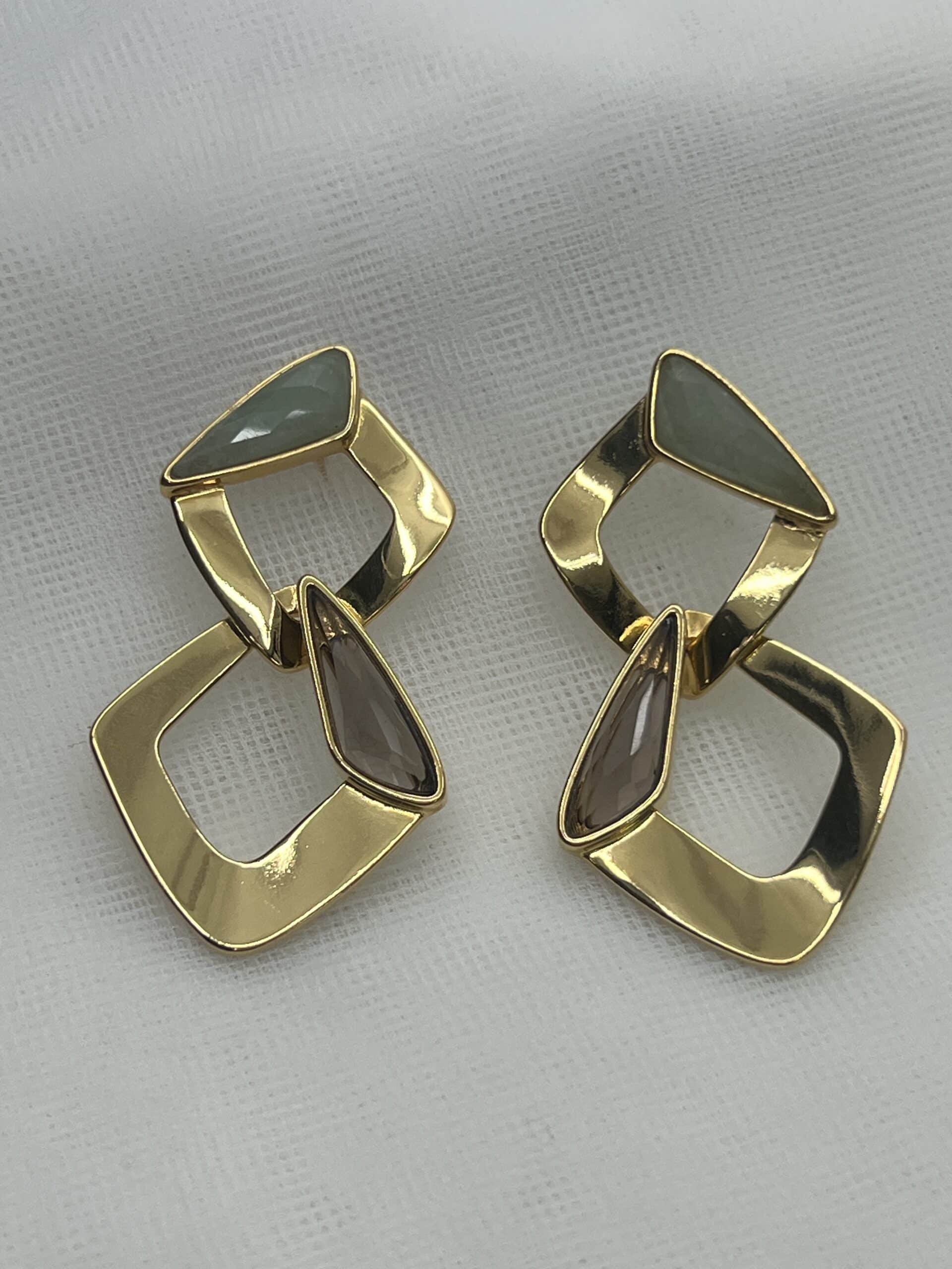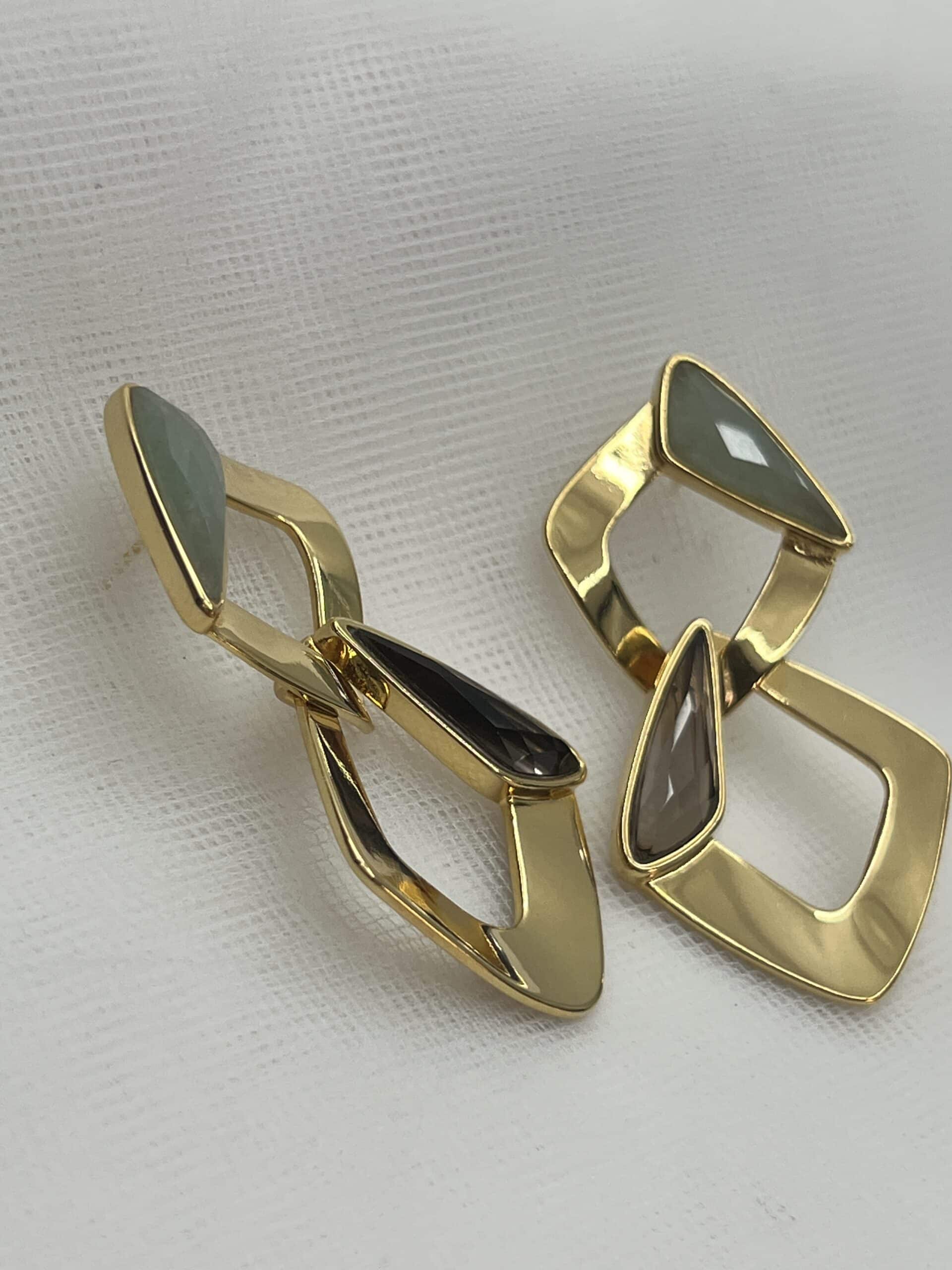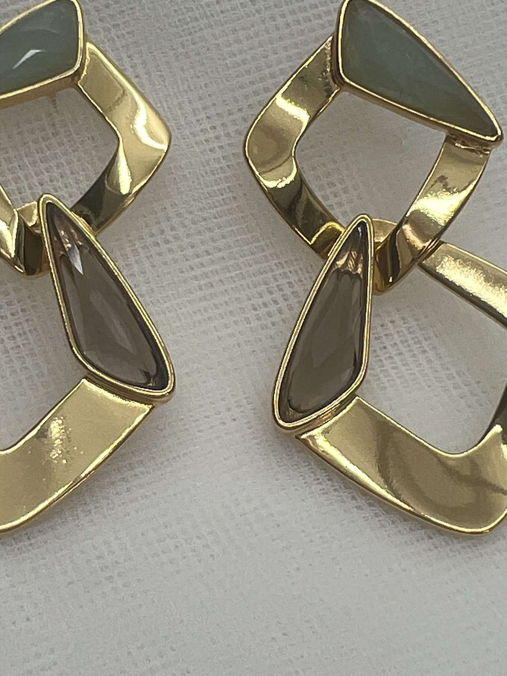 Pendientes de eslabones con forma de rombo y piedras naturales ,cuarzo fume y cuarzo verde.