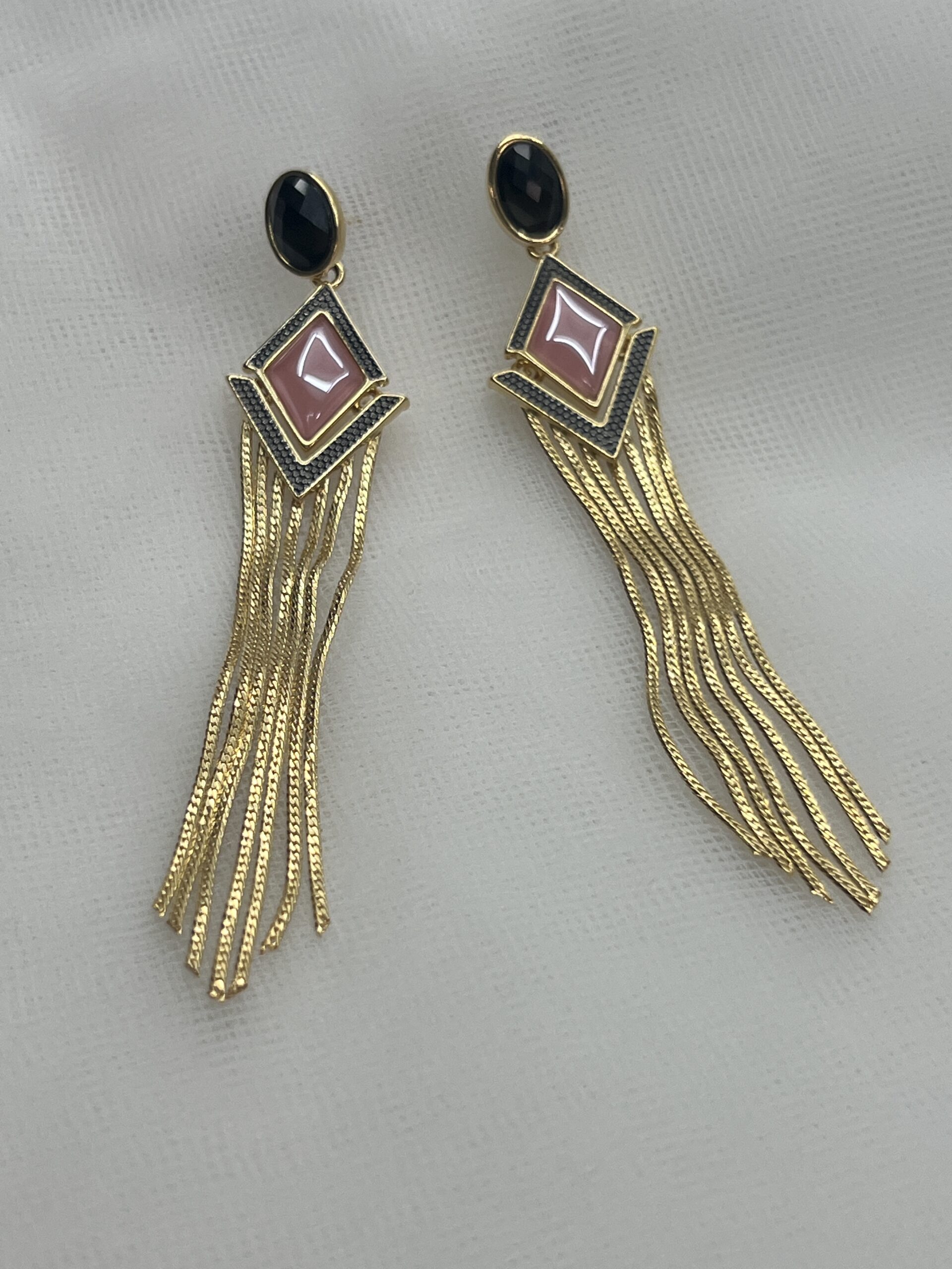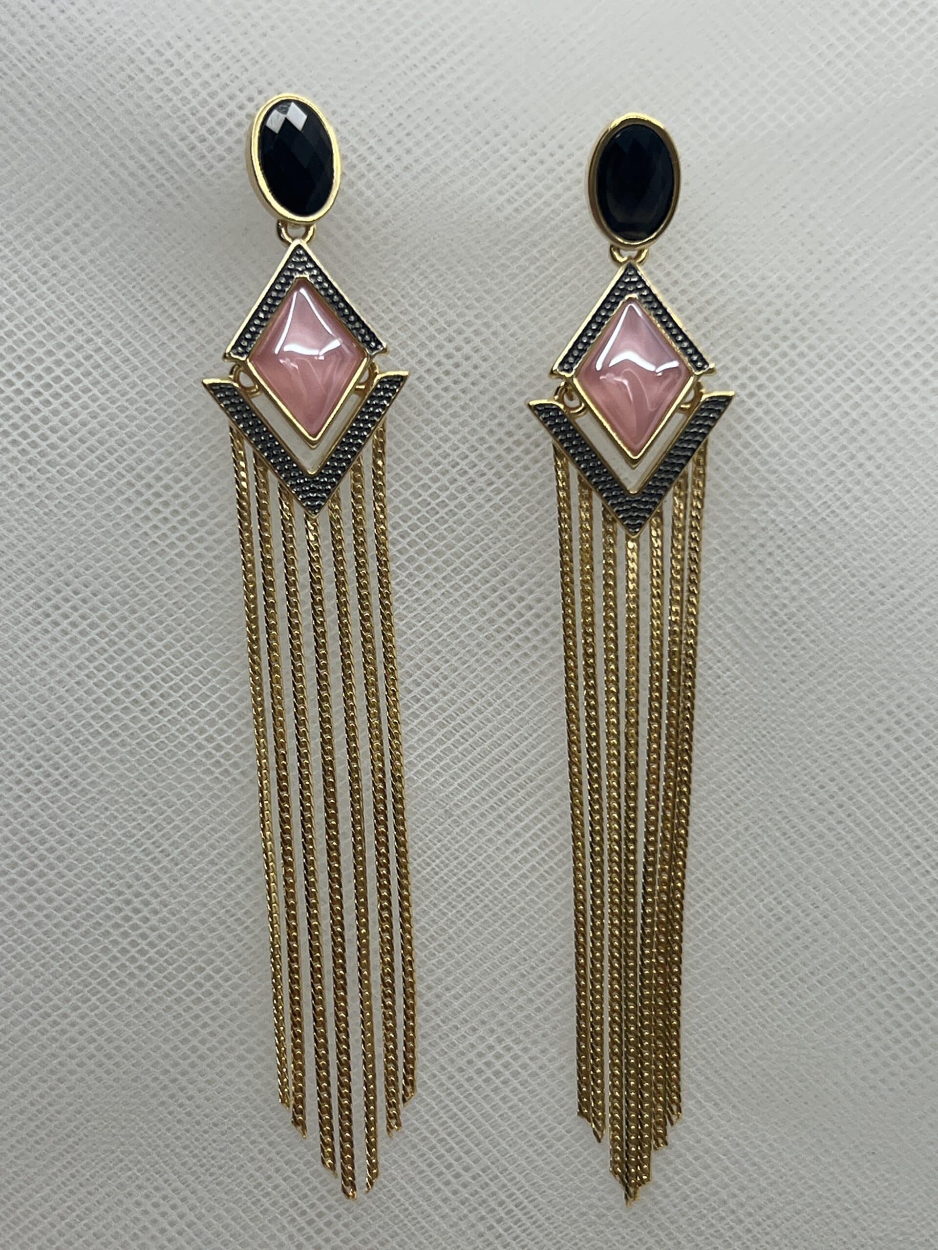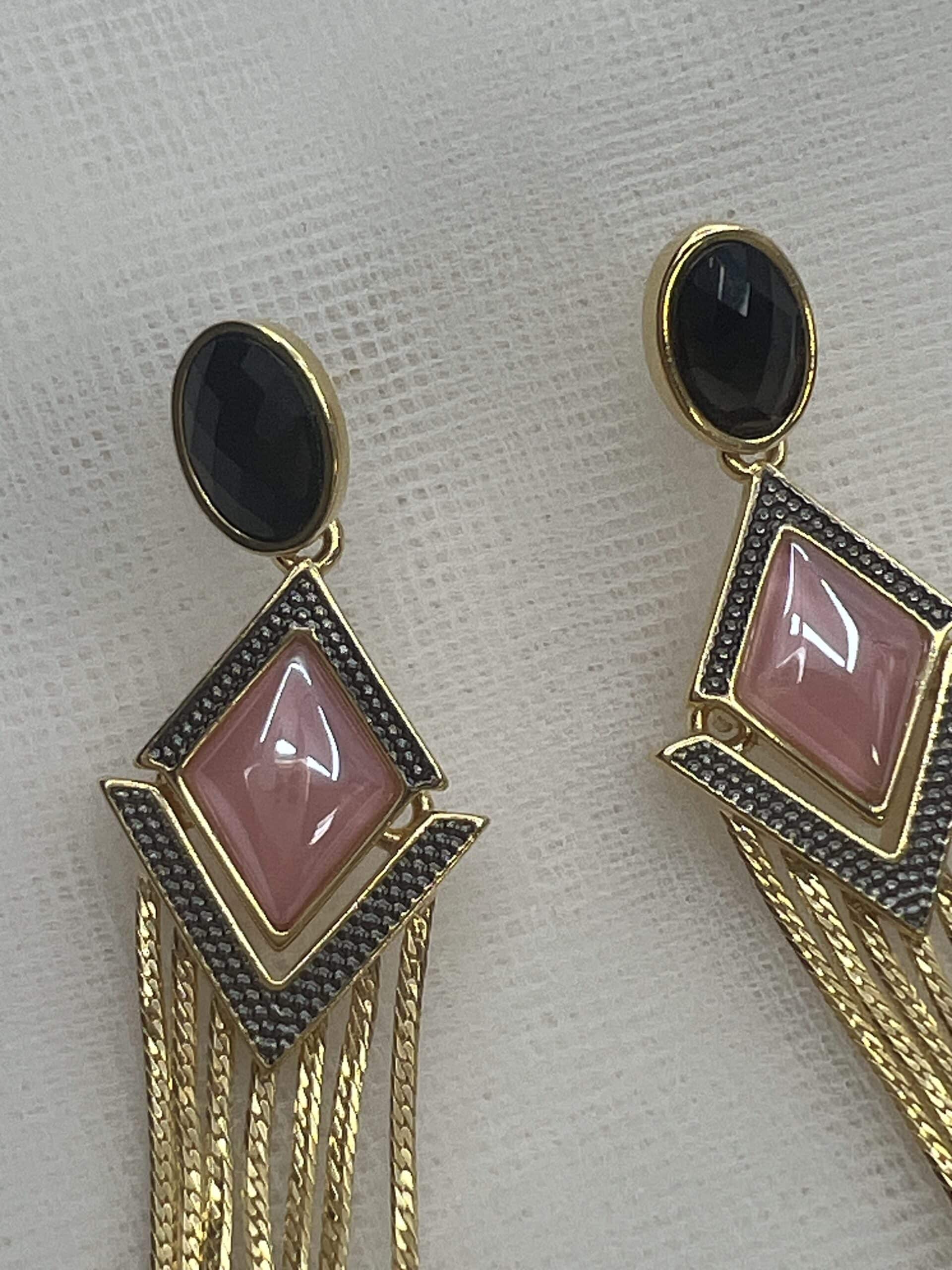 Pendientes maxi largos boton de onix y cuarzo rosa con cadenas desmontables.