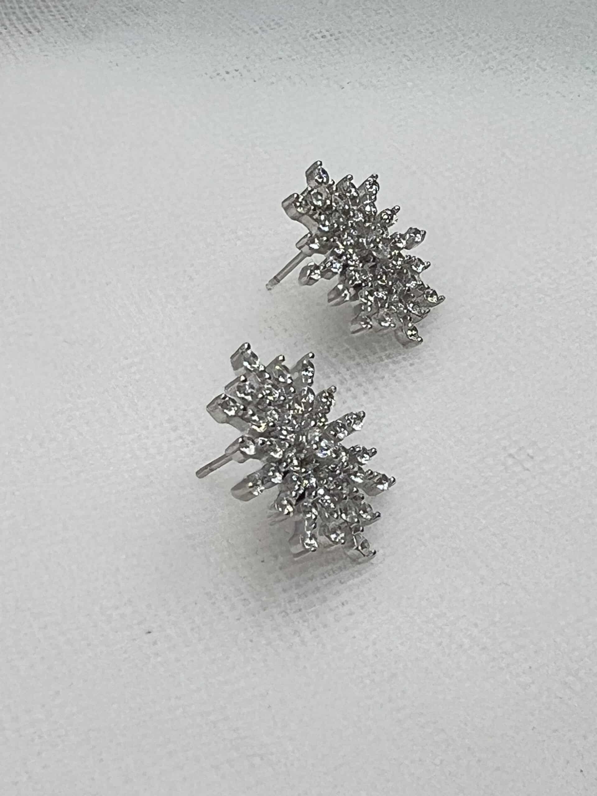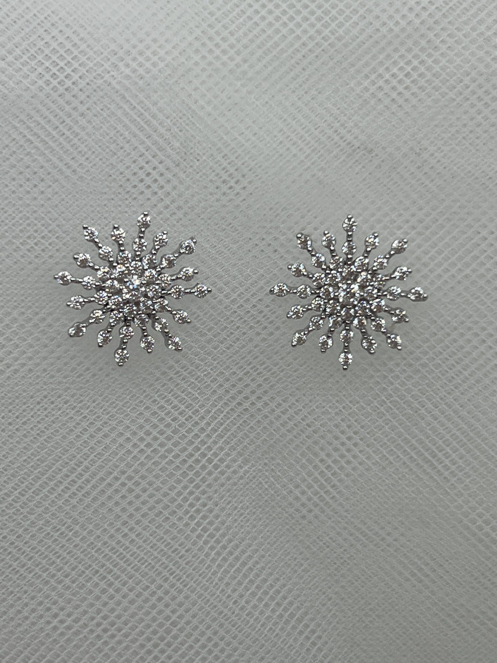 Pendientes de botón con forma de copo de nieve con circonitas rodiado en oro blanco.