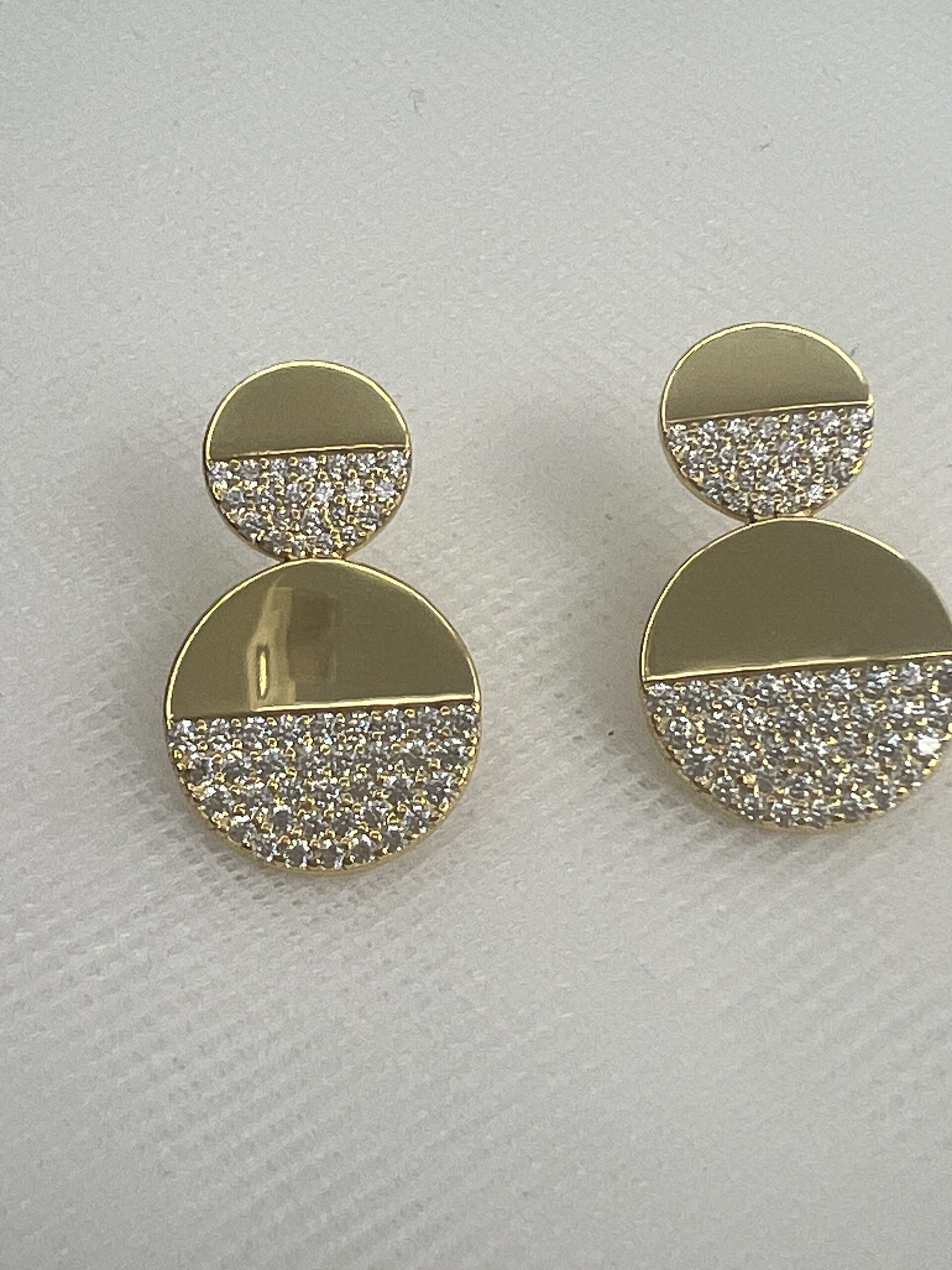 Pendientes de plata chapados en oro amarillo dobles circulos de tamaños distintos con circonitas engastadas.