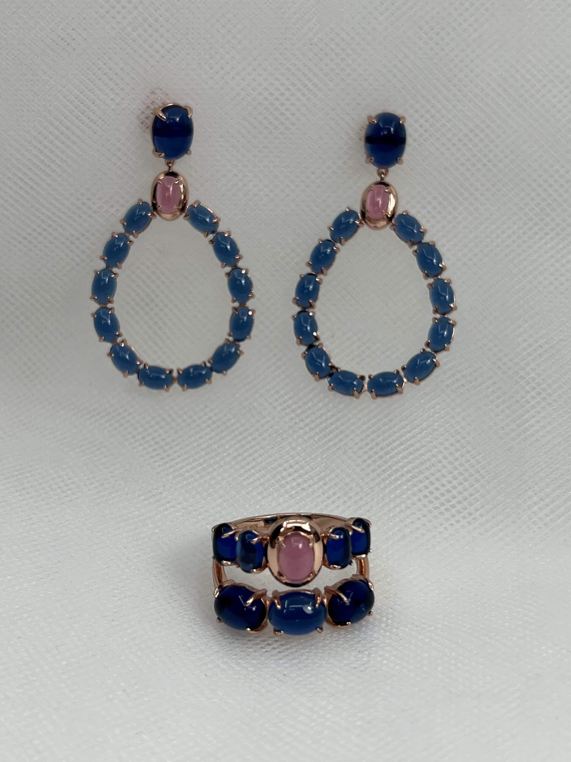 Pendientes de plata chapados en oro rosa con piedras cabujon azules y rosas.