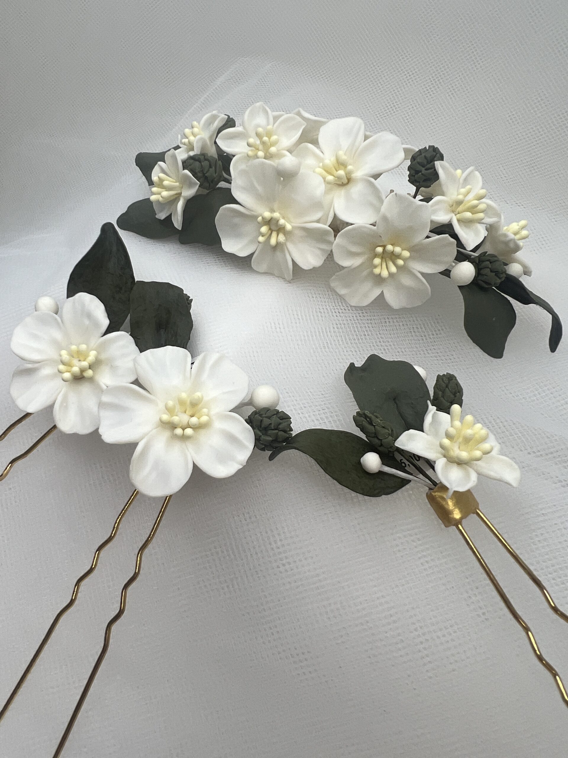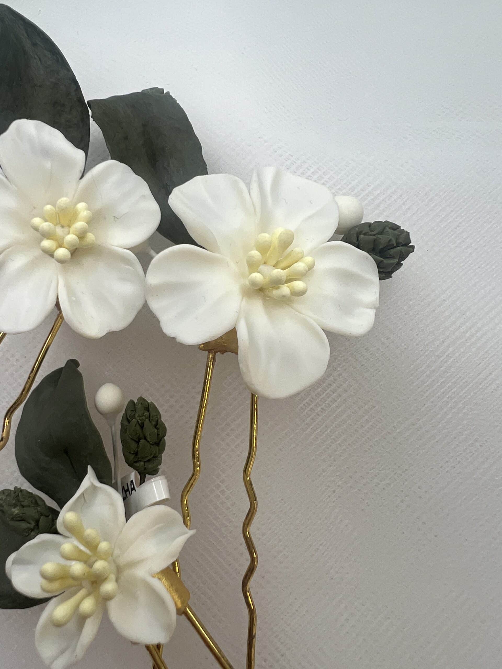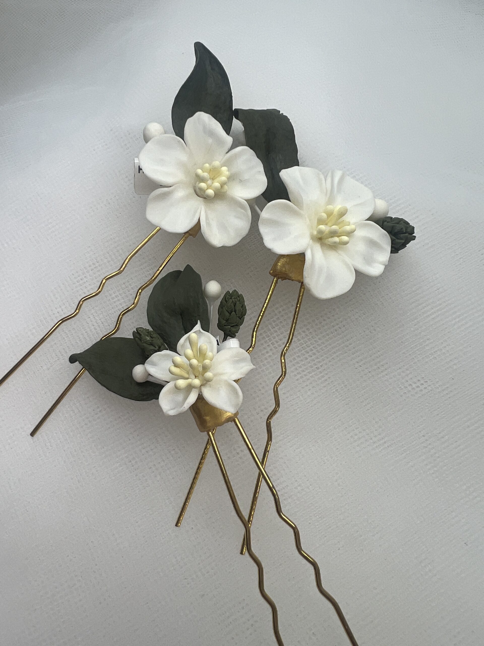 Horquillas de flor de azahar con hojas verdes de porcelana.