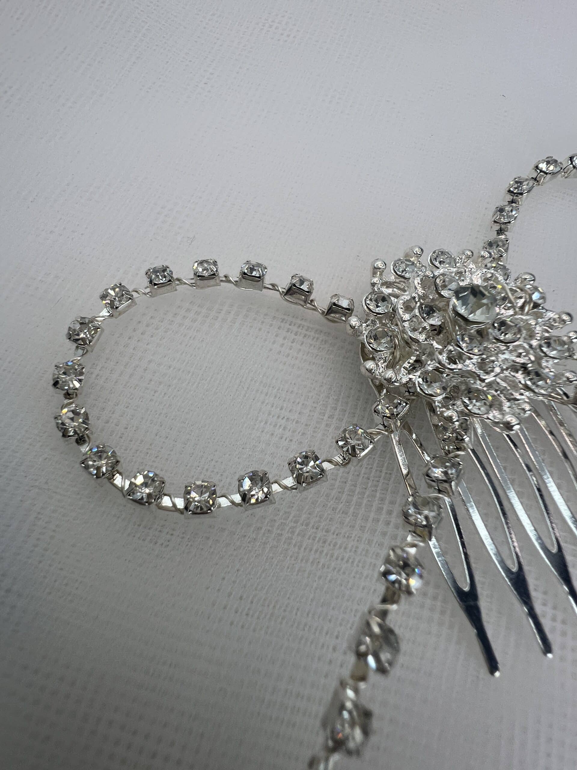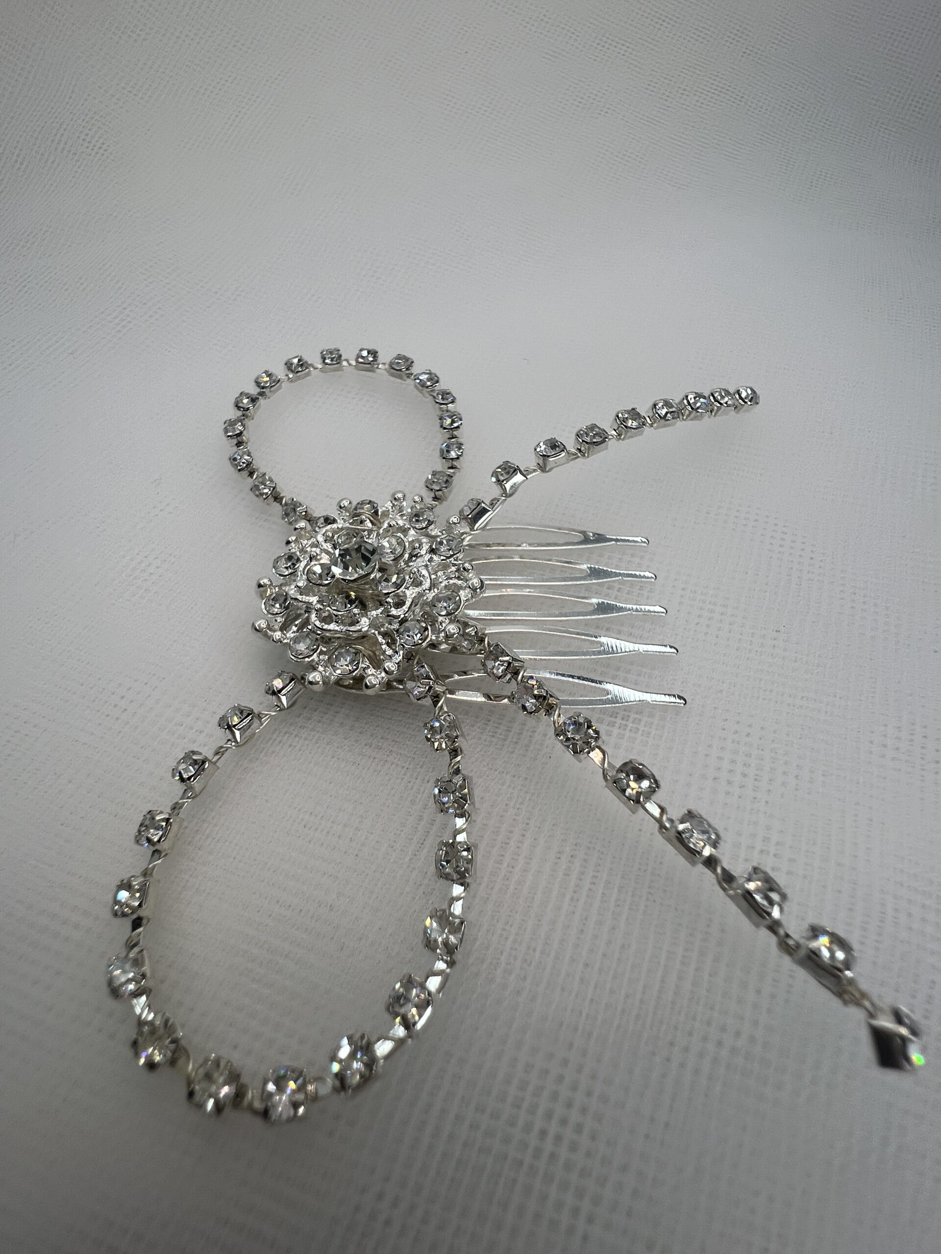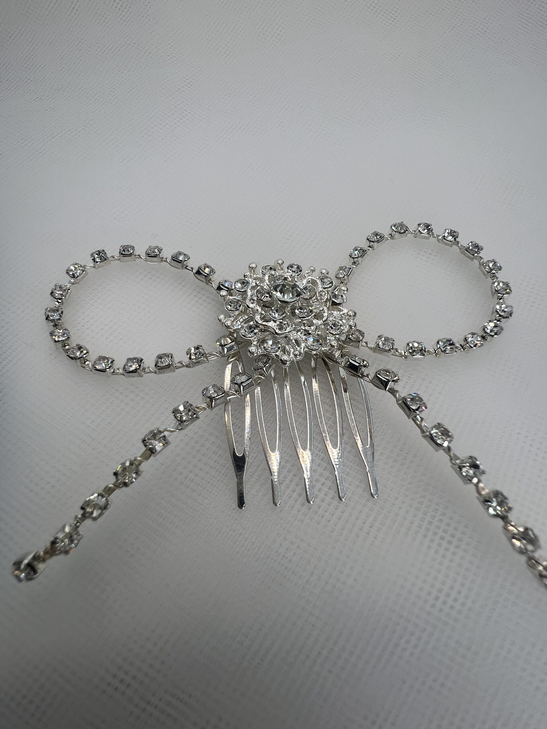Lazo de metal plateado con piedras blancas con peineta. Un toque muy sencillo pero elegante.
