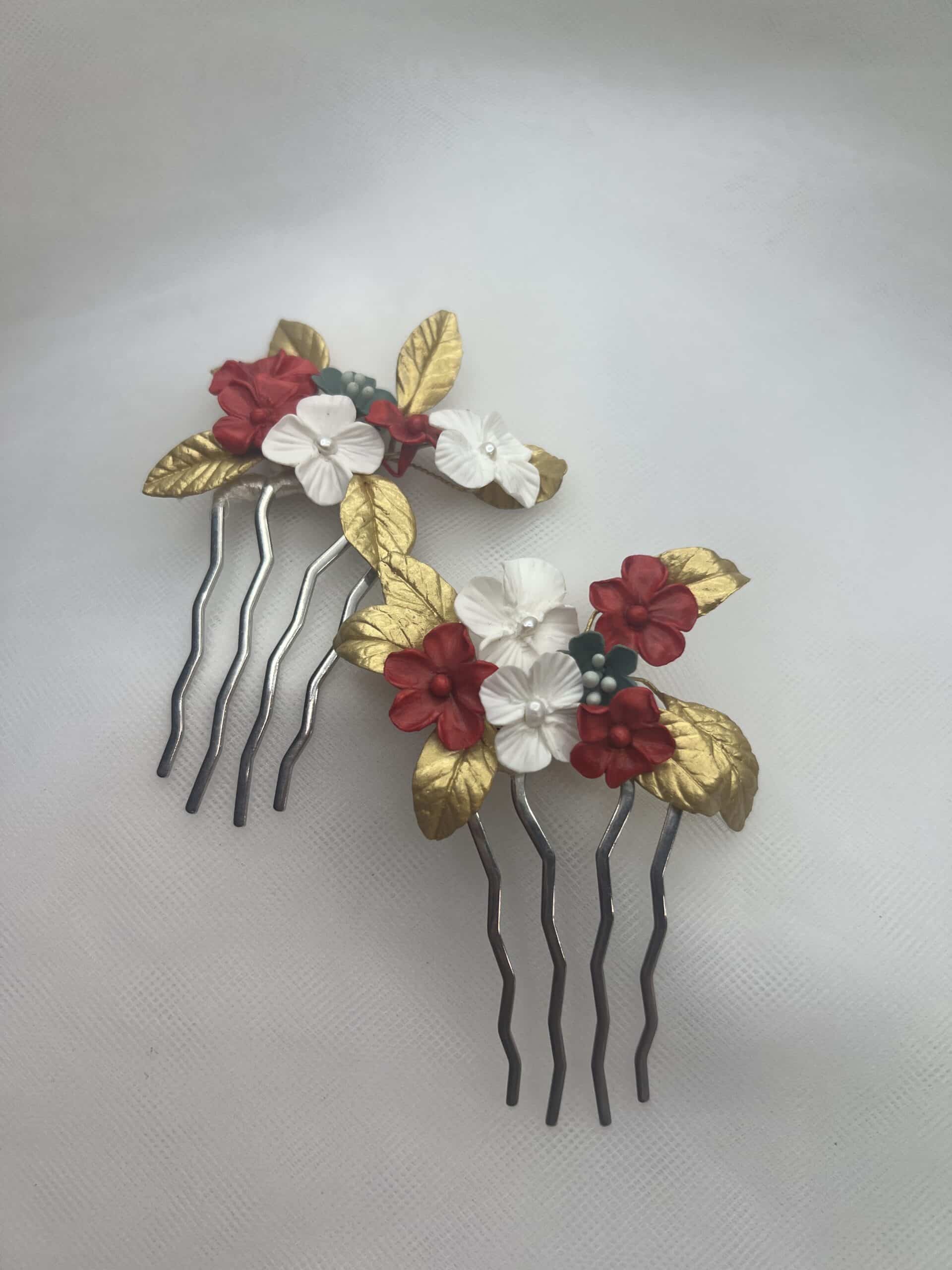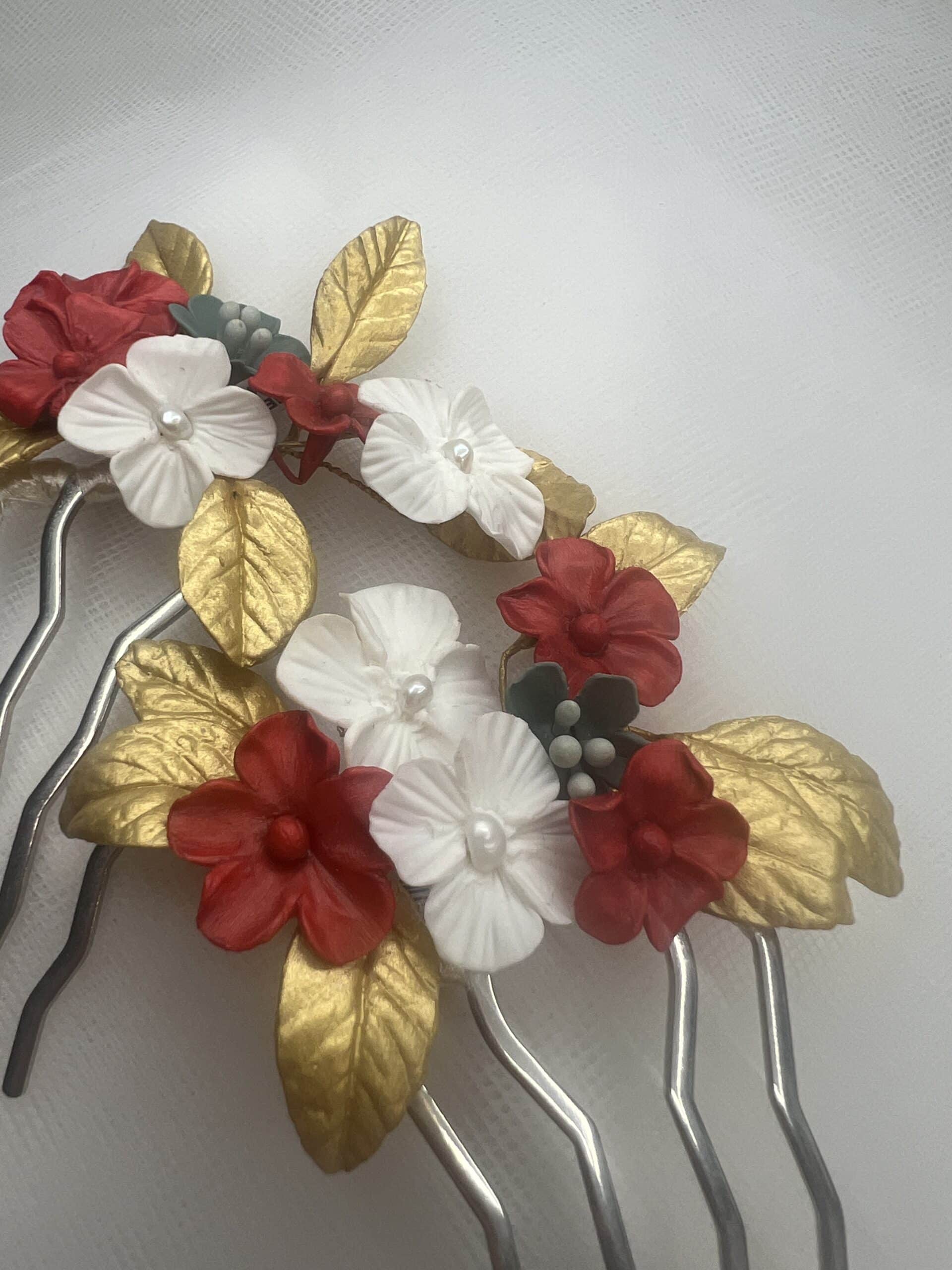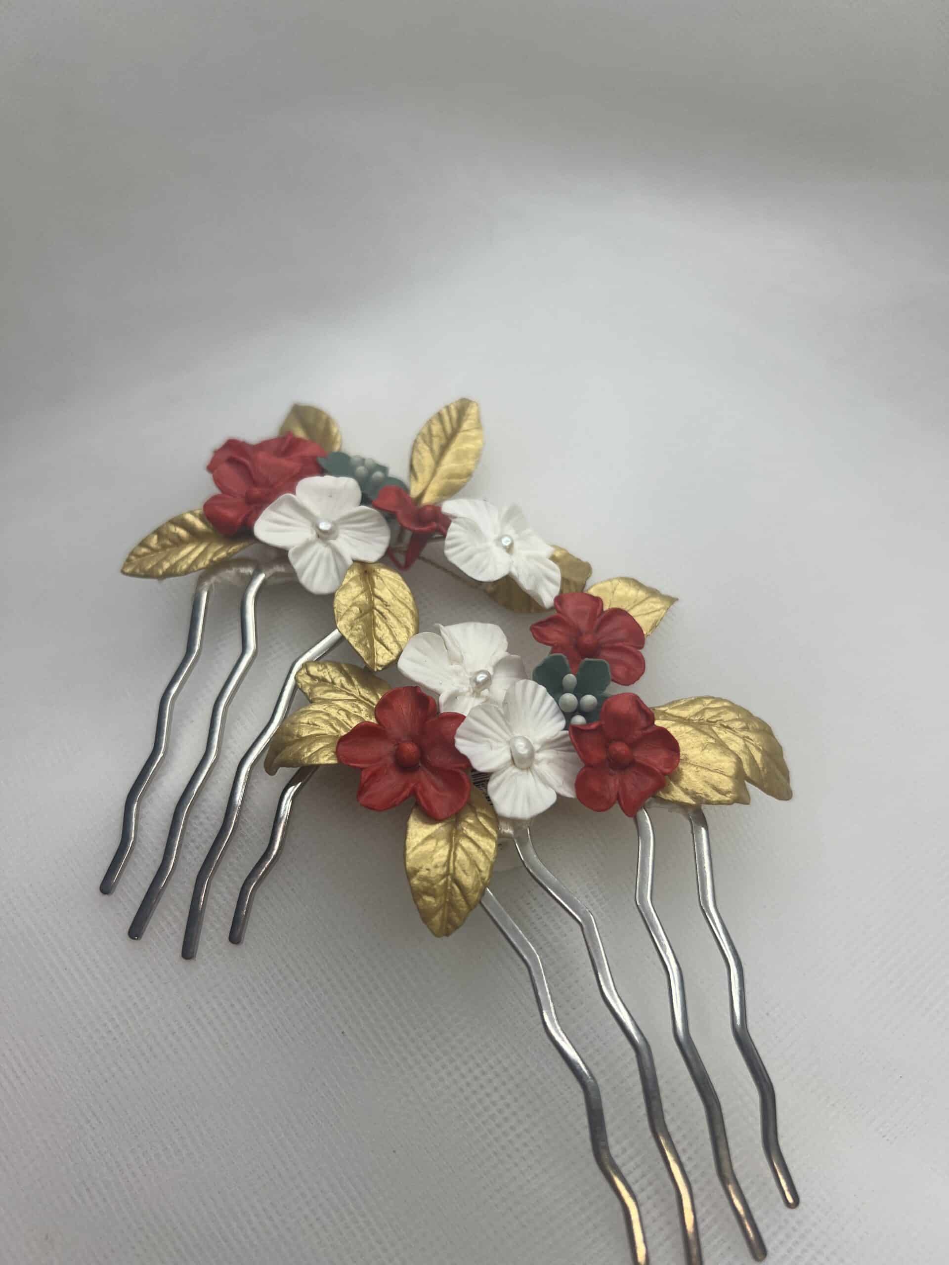 Tocado con flores rojas ,blancas ,verde y hojas doradas rematadas con peineta dorada .