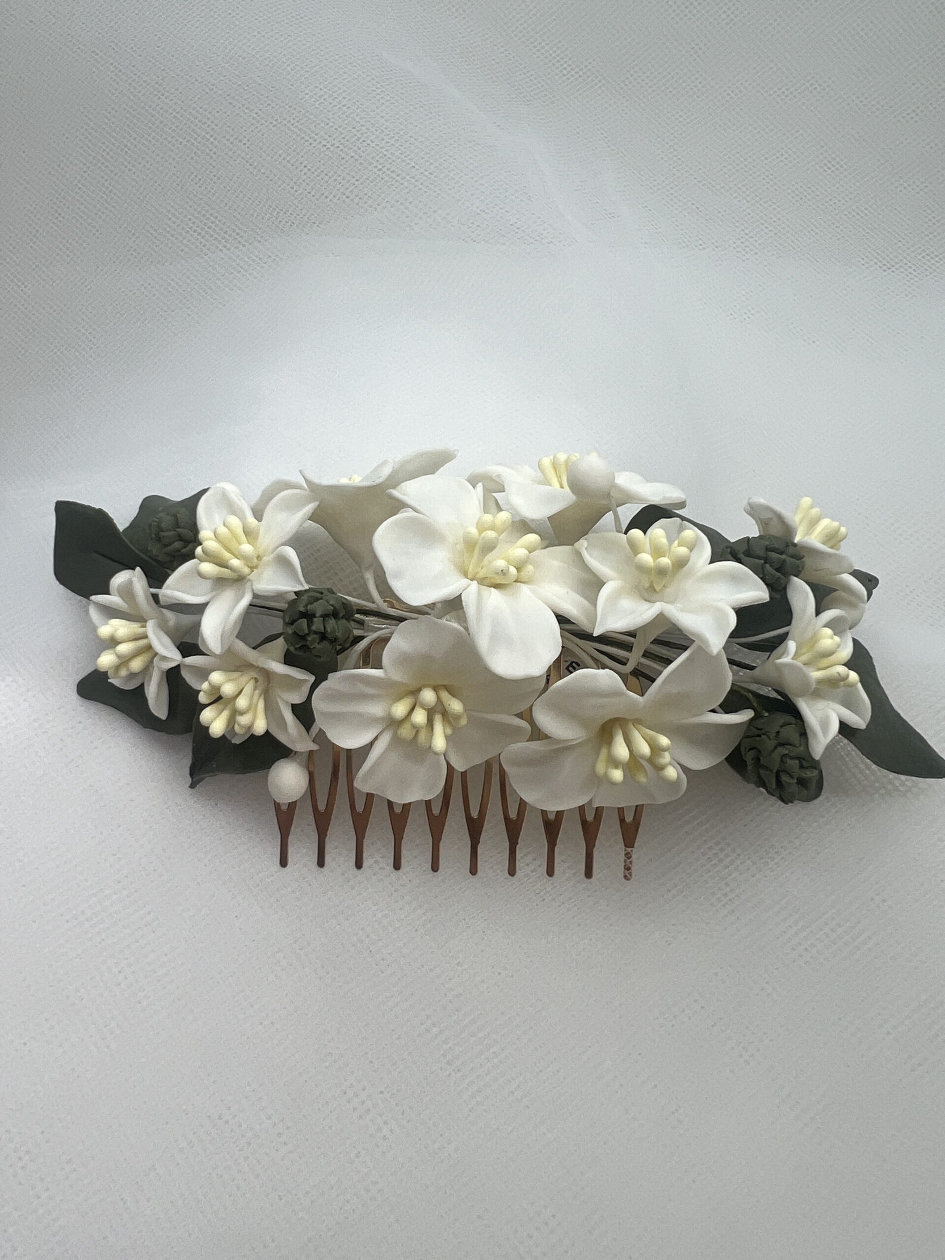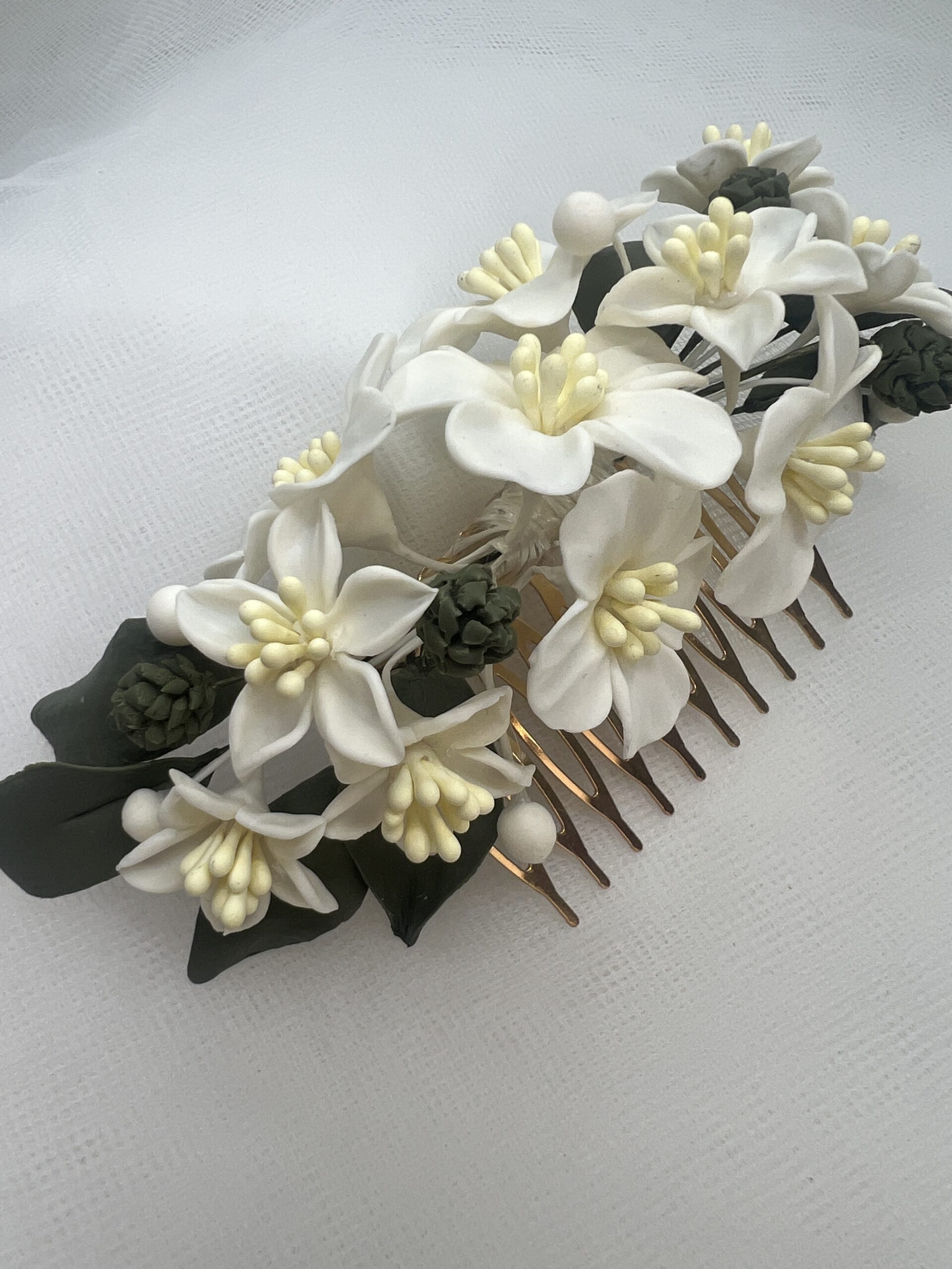 Tocado trasero con flores de azahar y hojas verdes de porcelana .