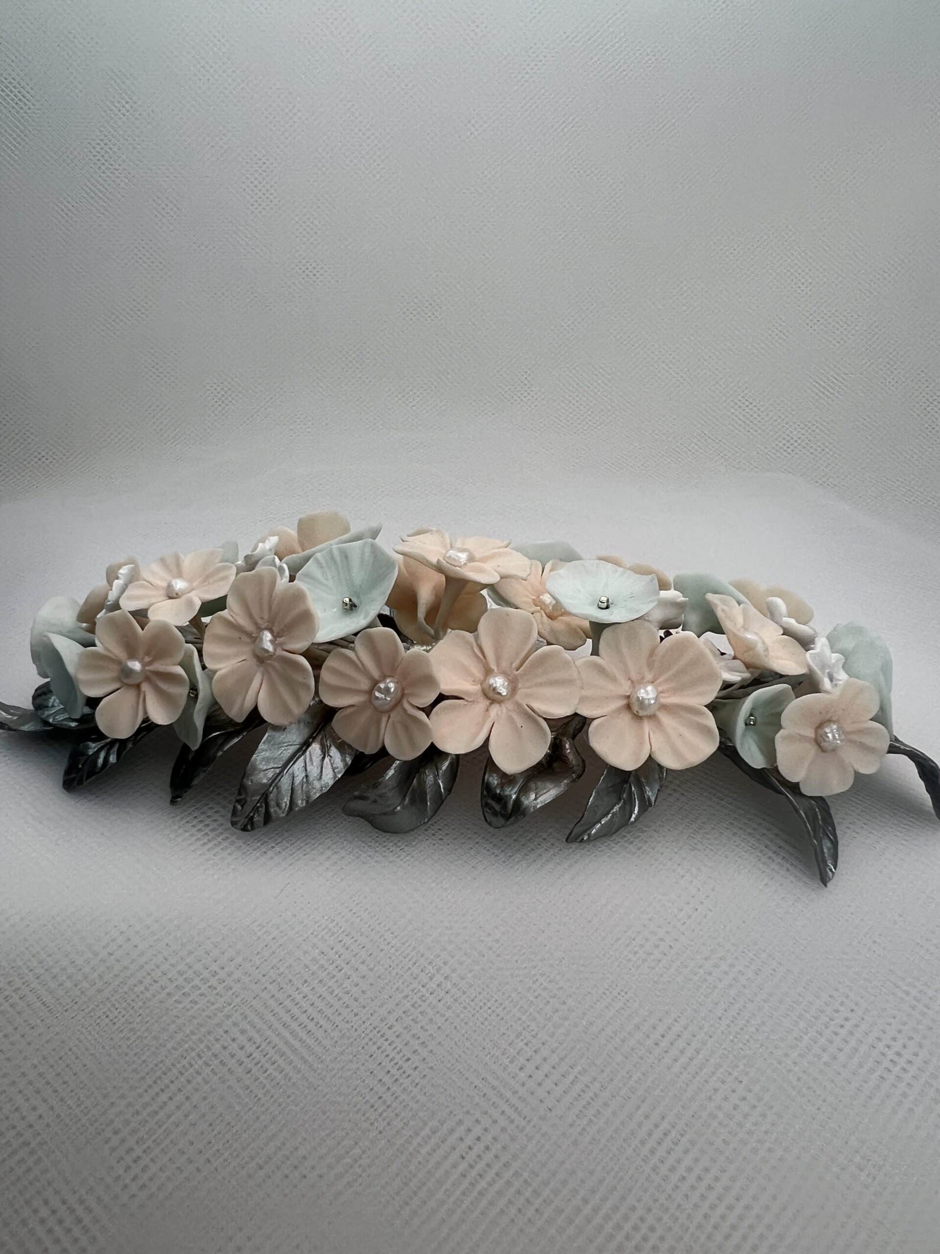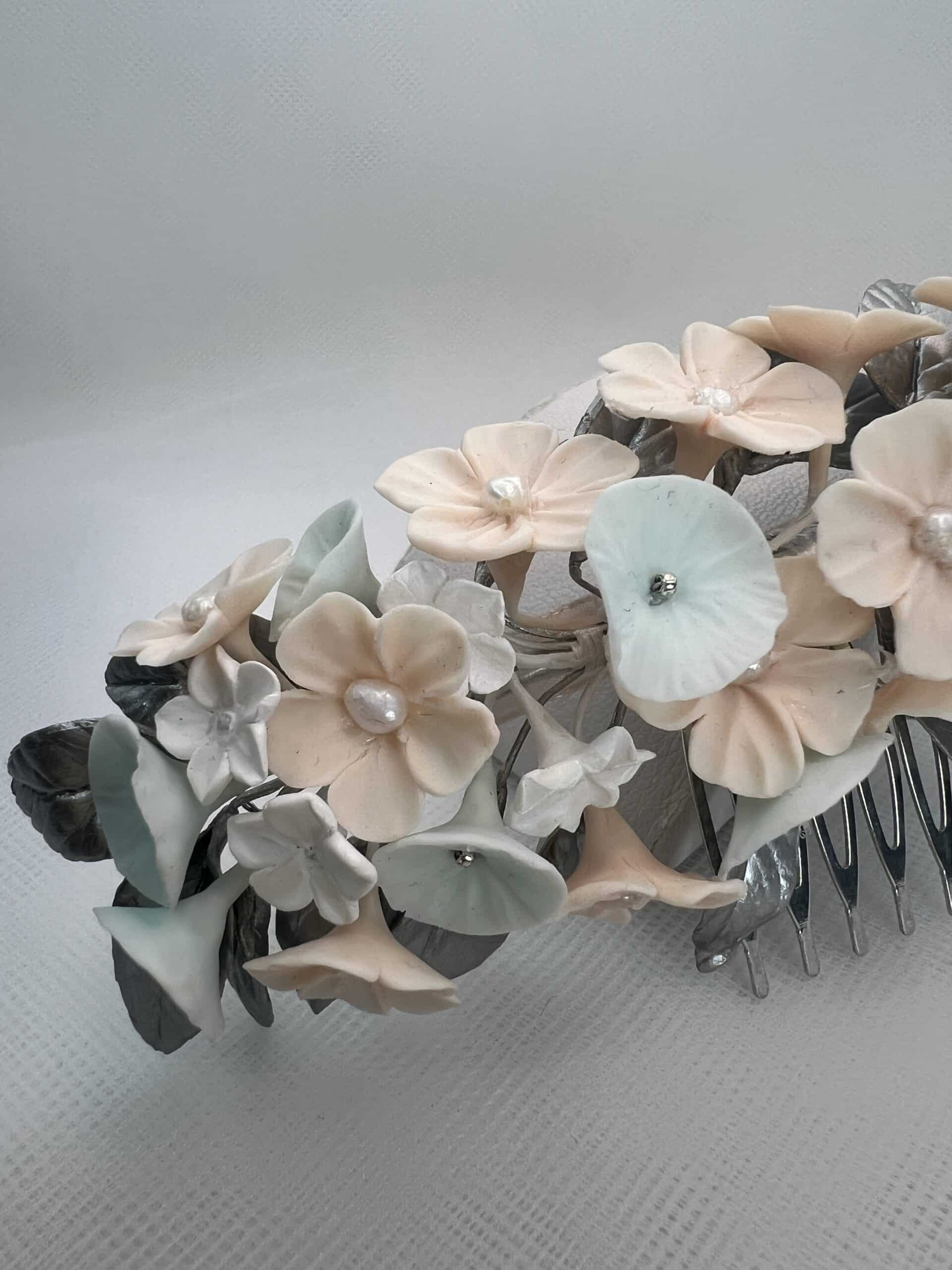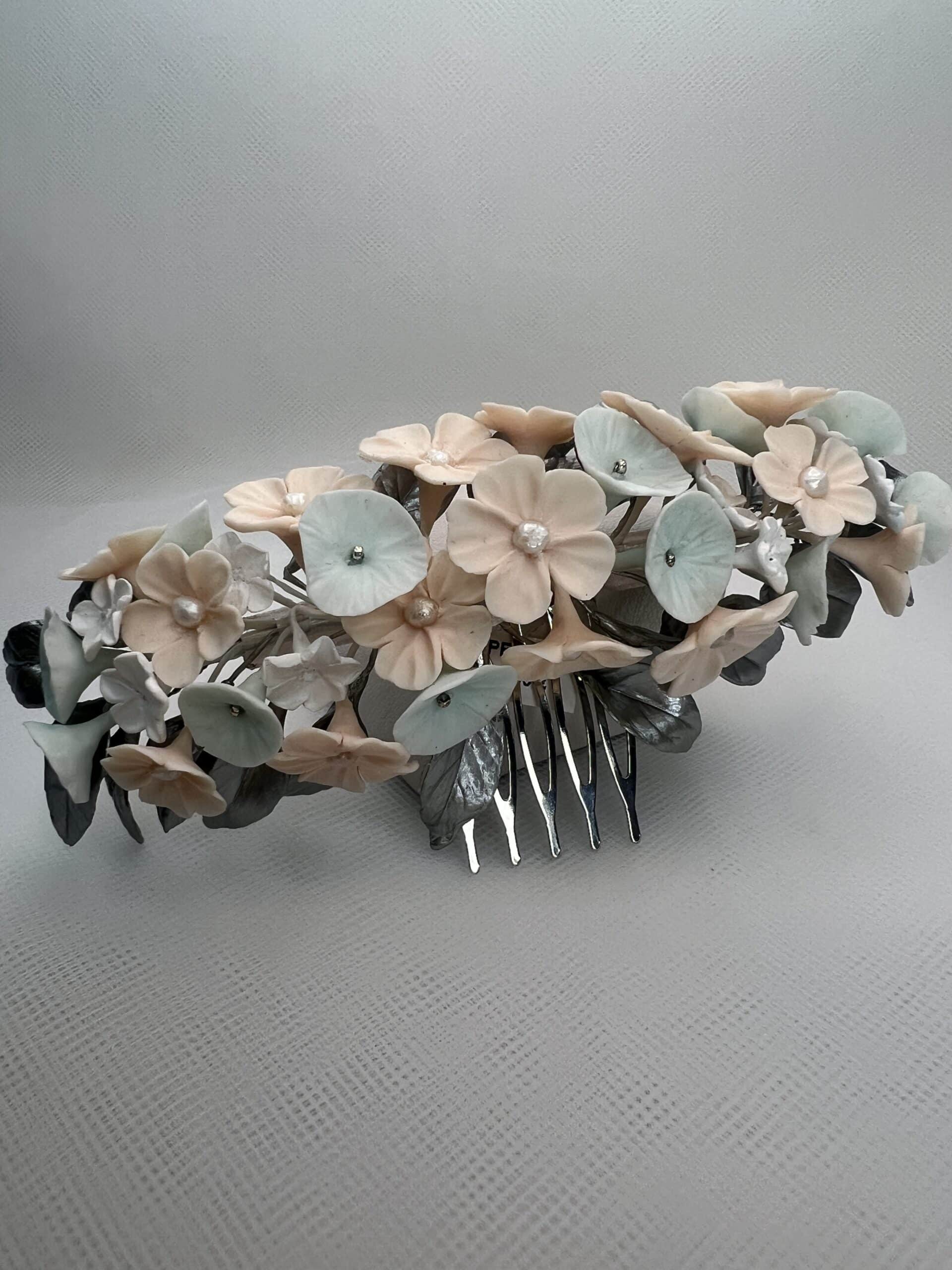 Tocado trasero de pequeñas flores blancas, rosas y menta con hojitas de color plata y perlitas naturales.