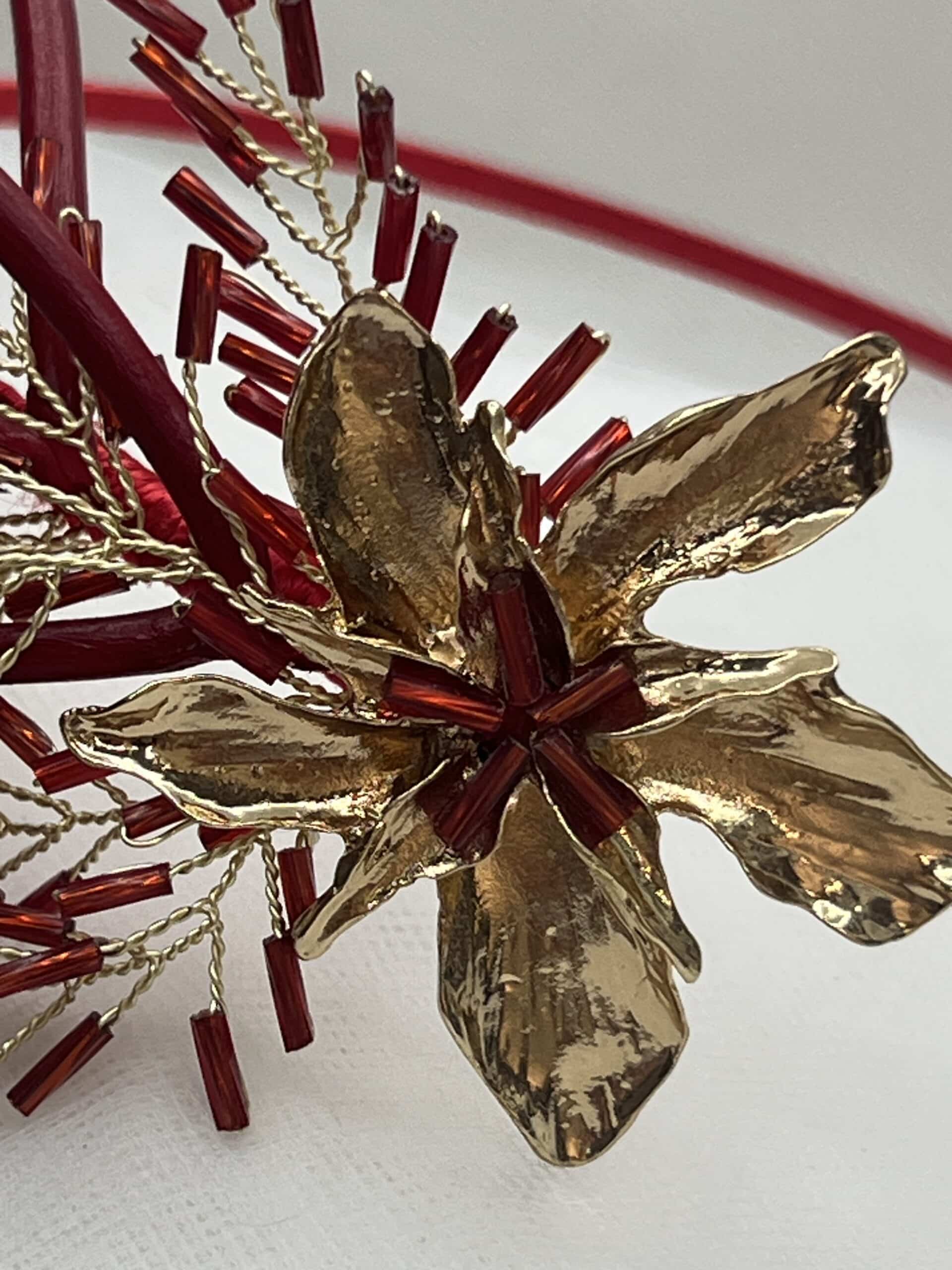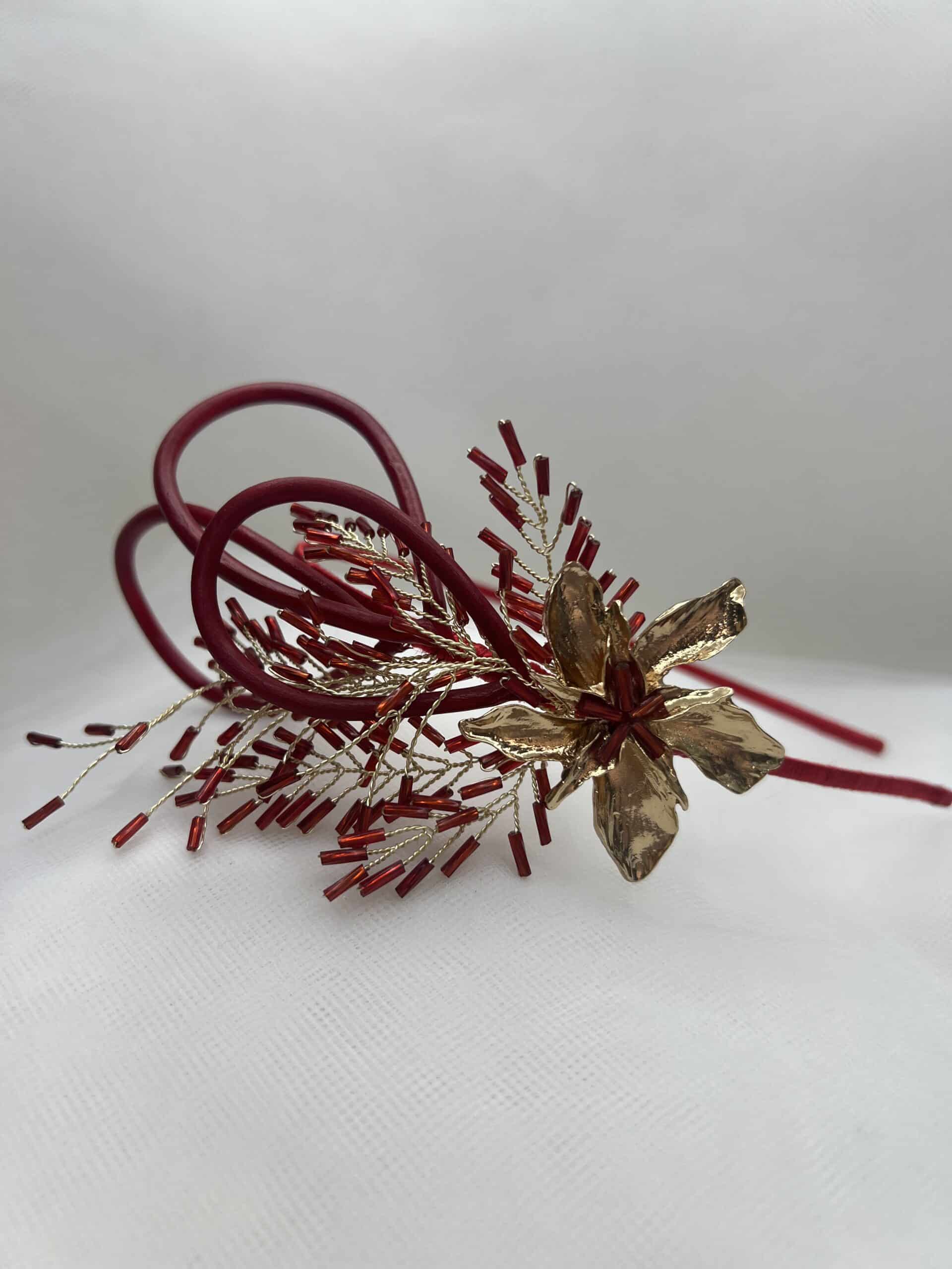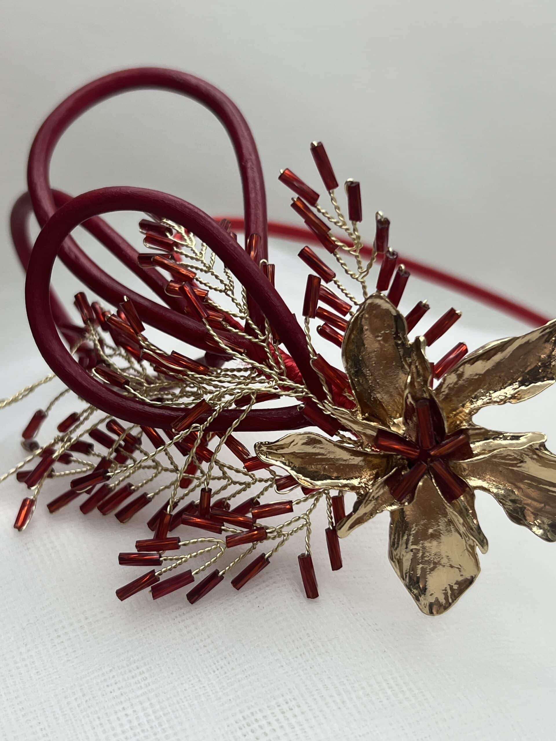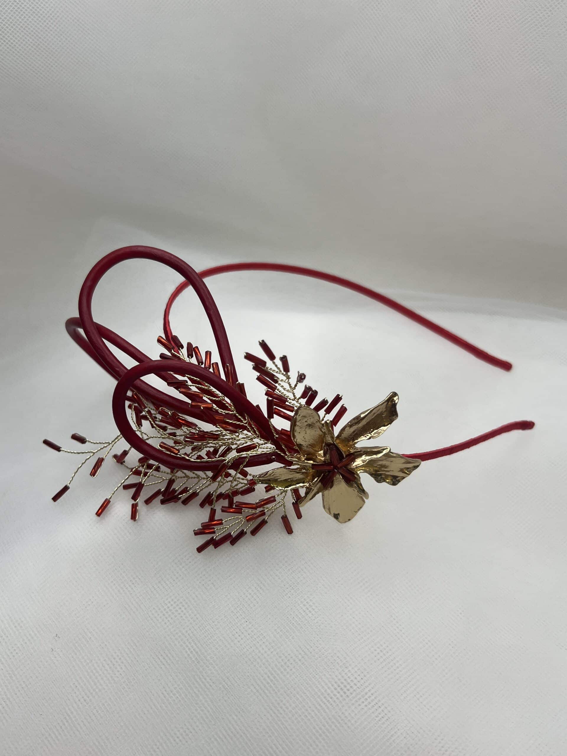 Diadema de aros rojos de porcelana con cuentas de cristal y broche dorado , forrada con hilo de seda .