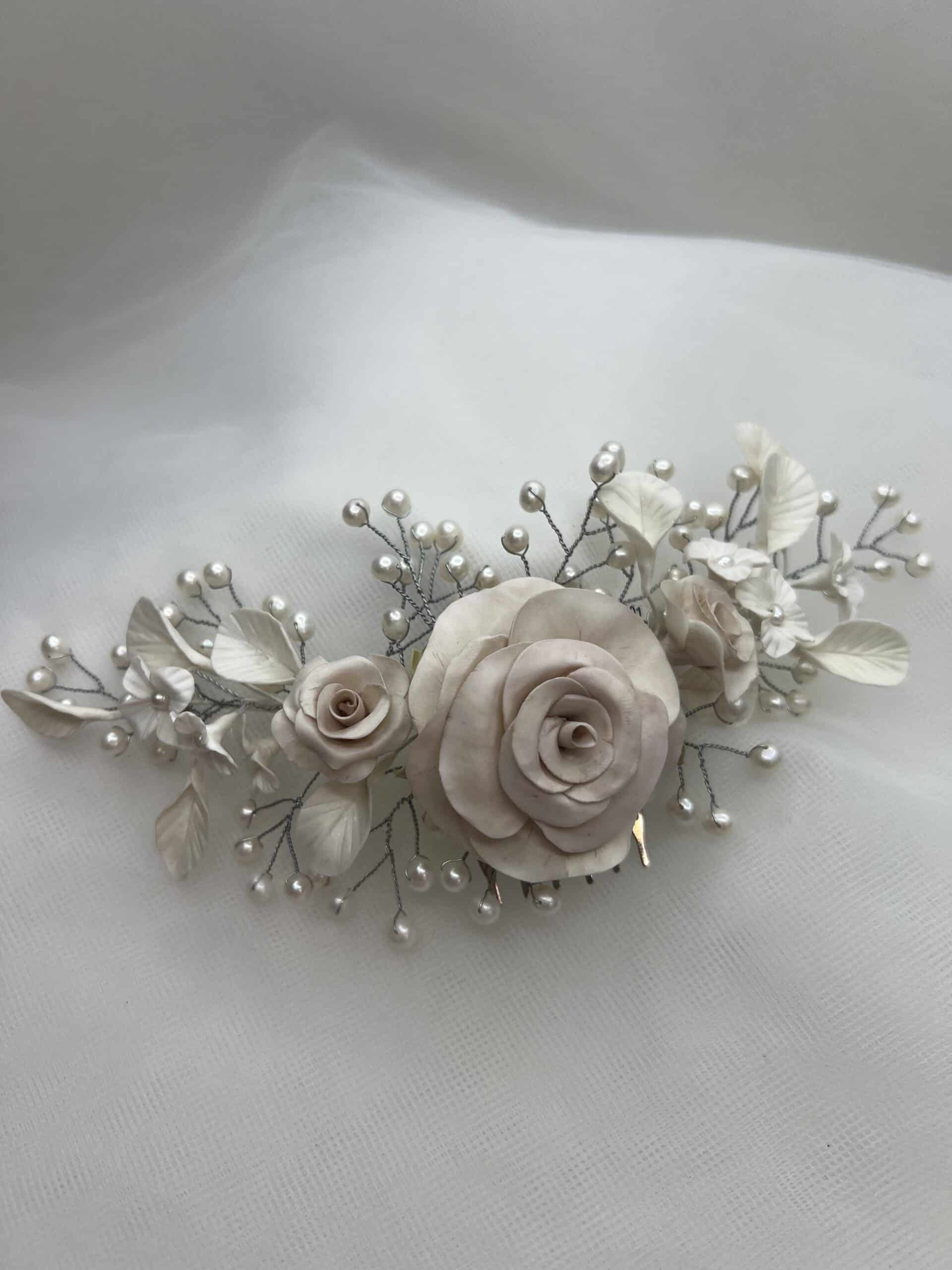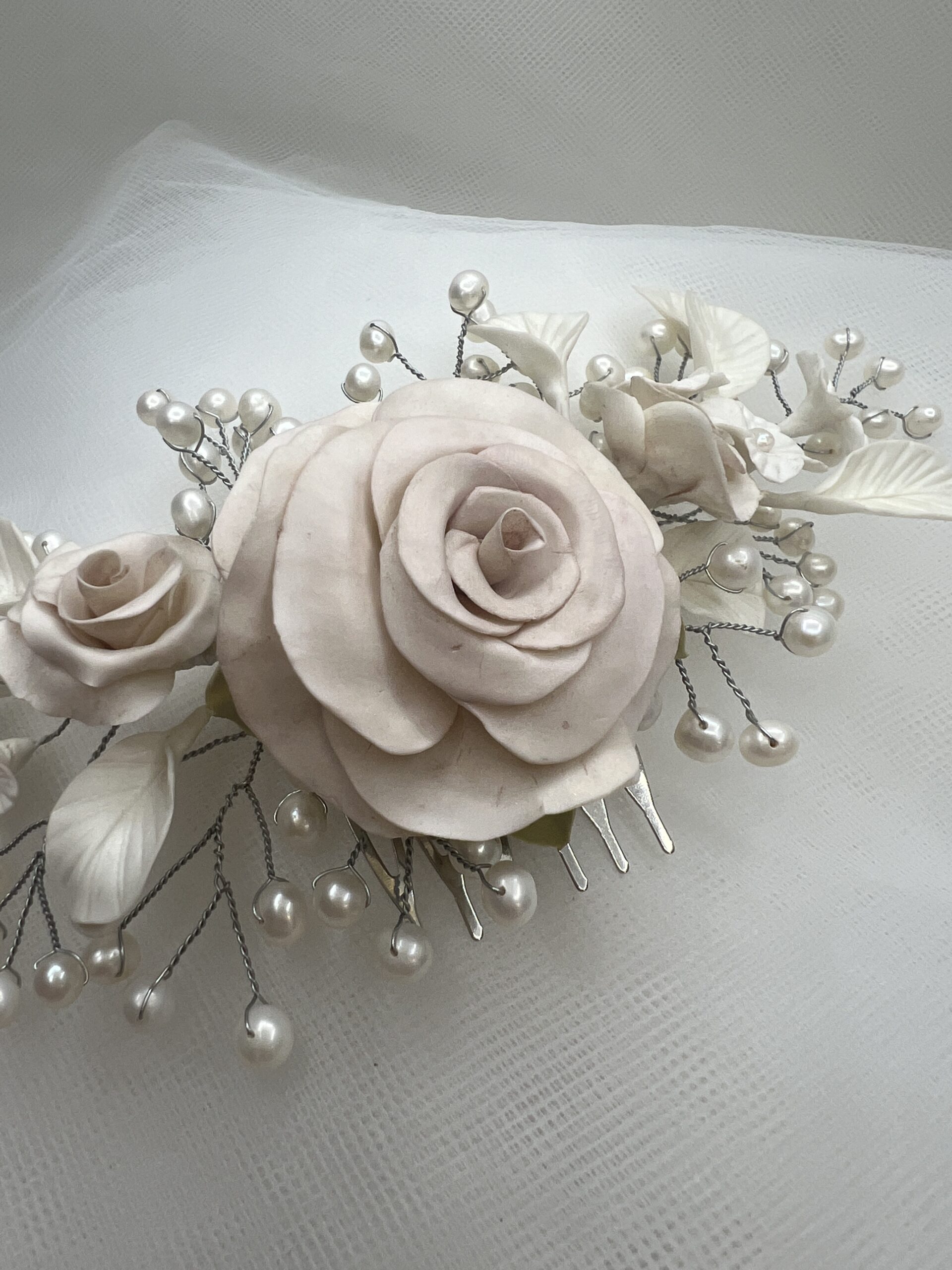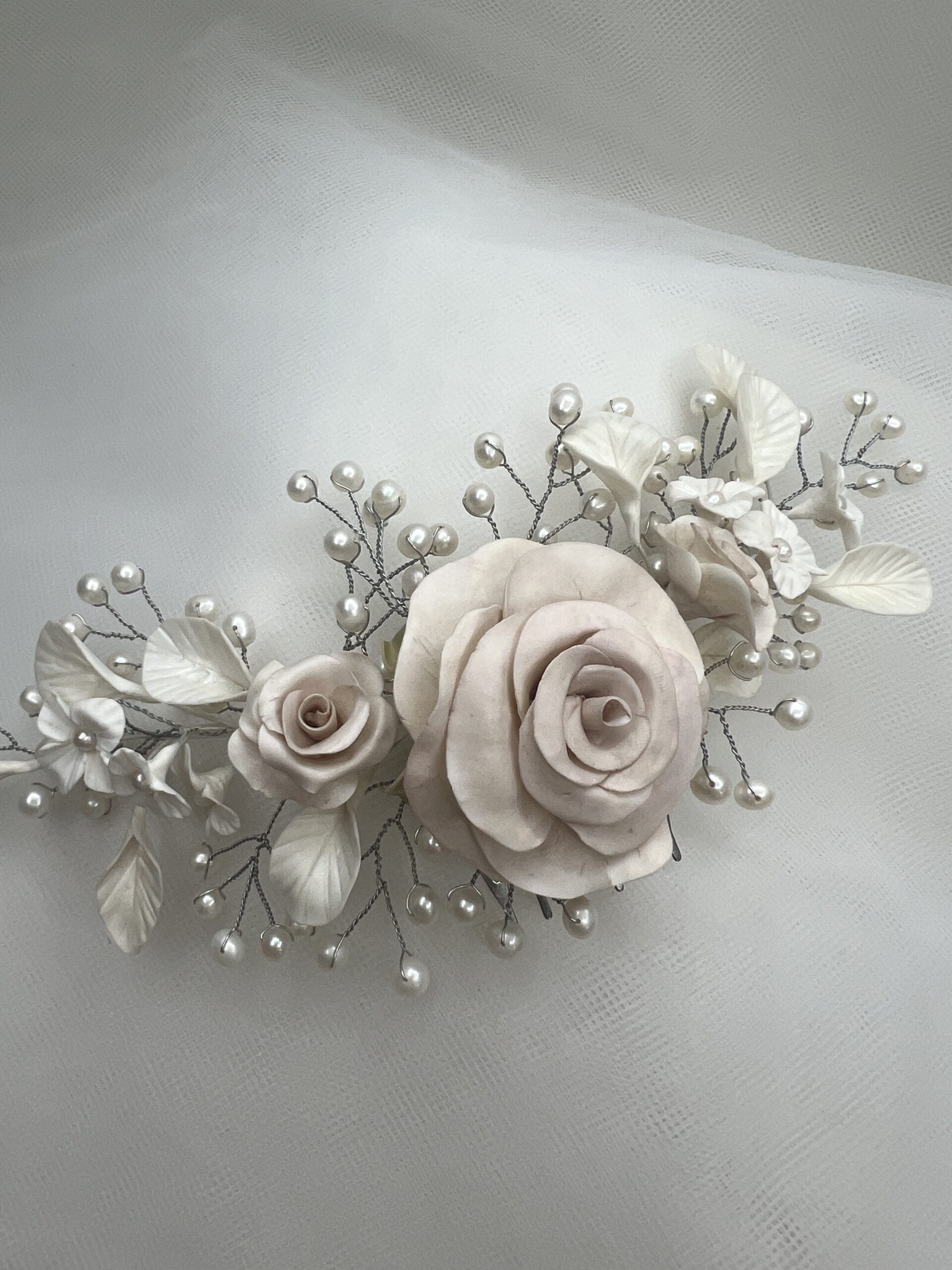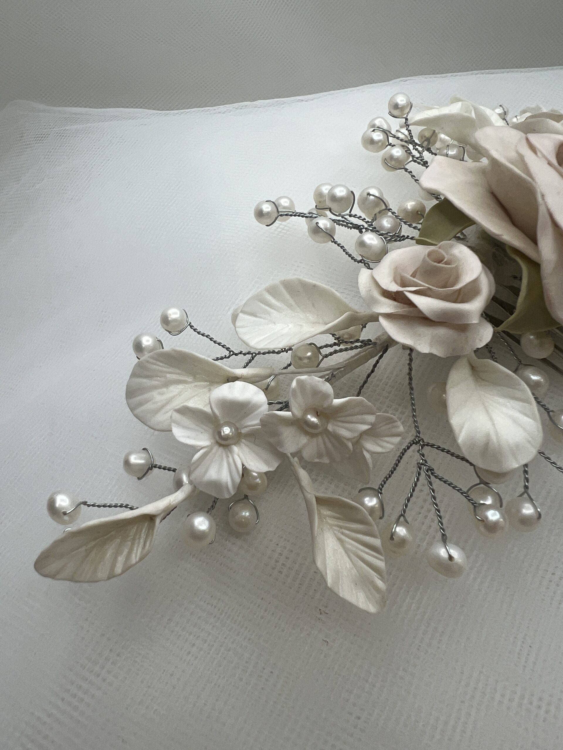 Tocado de porcelana con un centro de tres rosas de color rosa empolvado y formando alrededor un conjunto de florecillas y hojas de color blanco con ramilletes de perlas naturales , de aire romantico que se puede llevar sobre cualquier tipo de peinado.