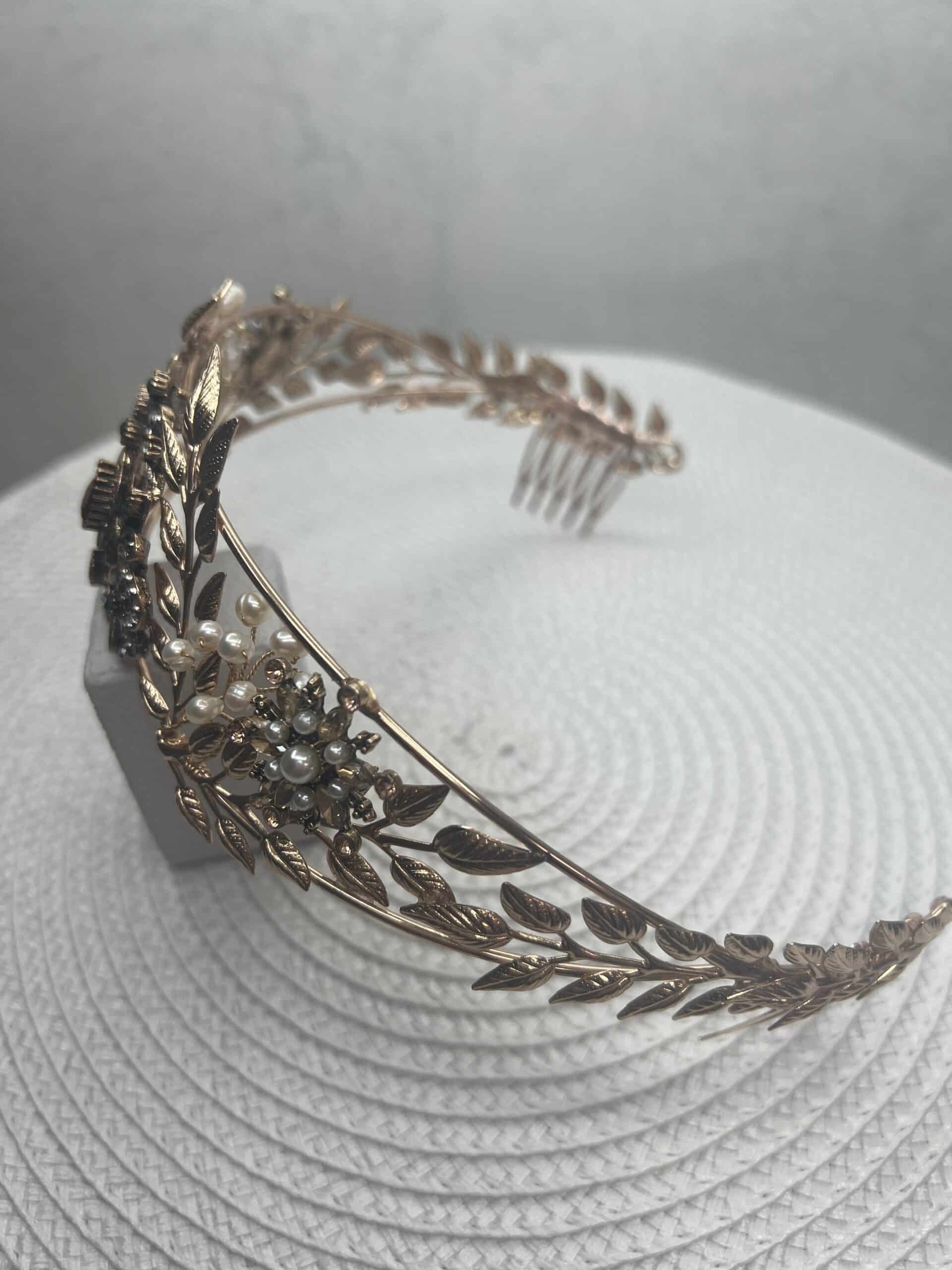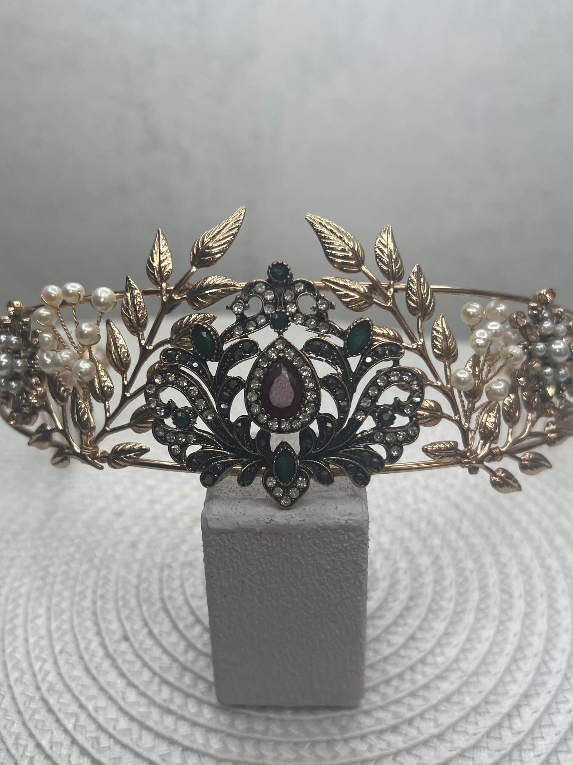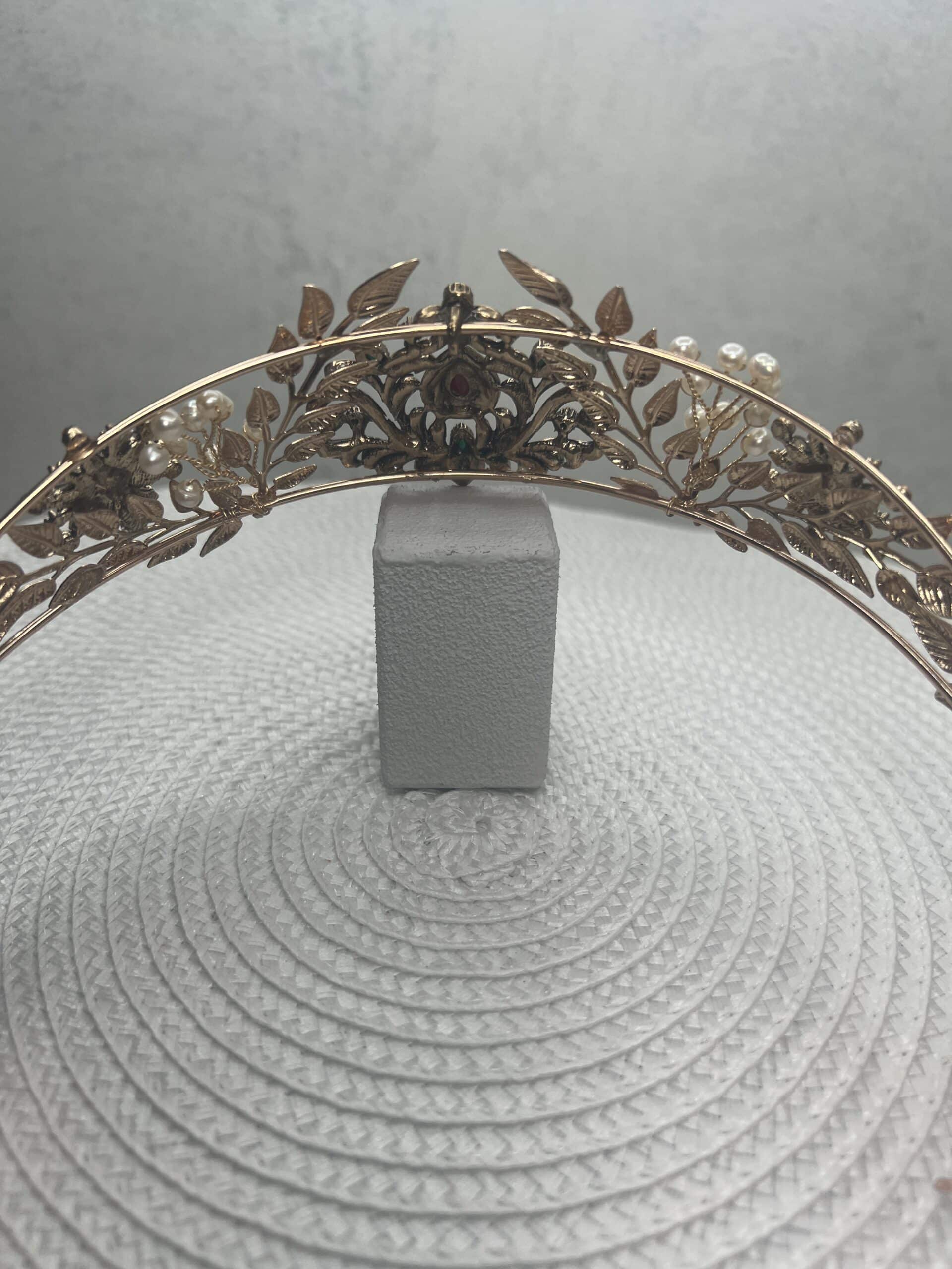 Tiara con gran broche central con piedras verdes , blancas y roja , lleva adornos metalicos de hojas y estrellas con perlas y piedras , ademas tiene unos ramilletes de perlas naturales, la tiara es de color rosado y el broche dorado envejecido creando un contraste muy especial.