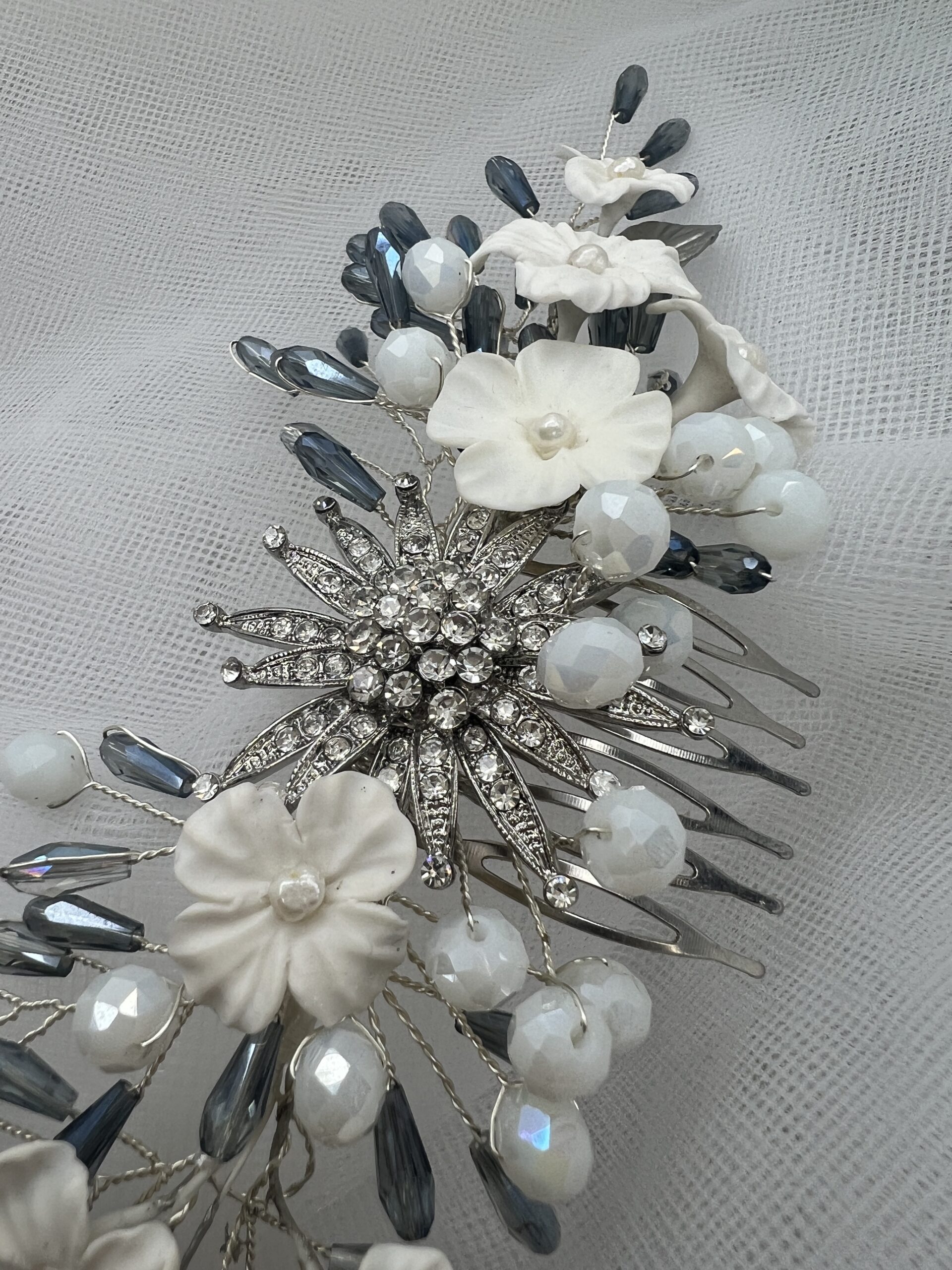 Tocado en tonos blancos y azules, delicadas flores de porcelana con ramilletes de piedras azules y blancas tornasoladas que dan un toque de luz y brillo al conjunto. En el centro el broche con forma de estrella lo hace realmente especial.