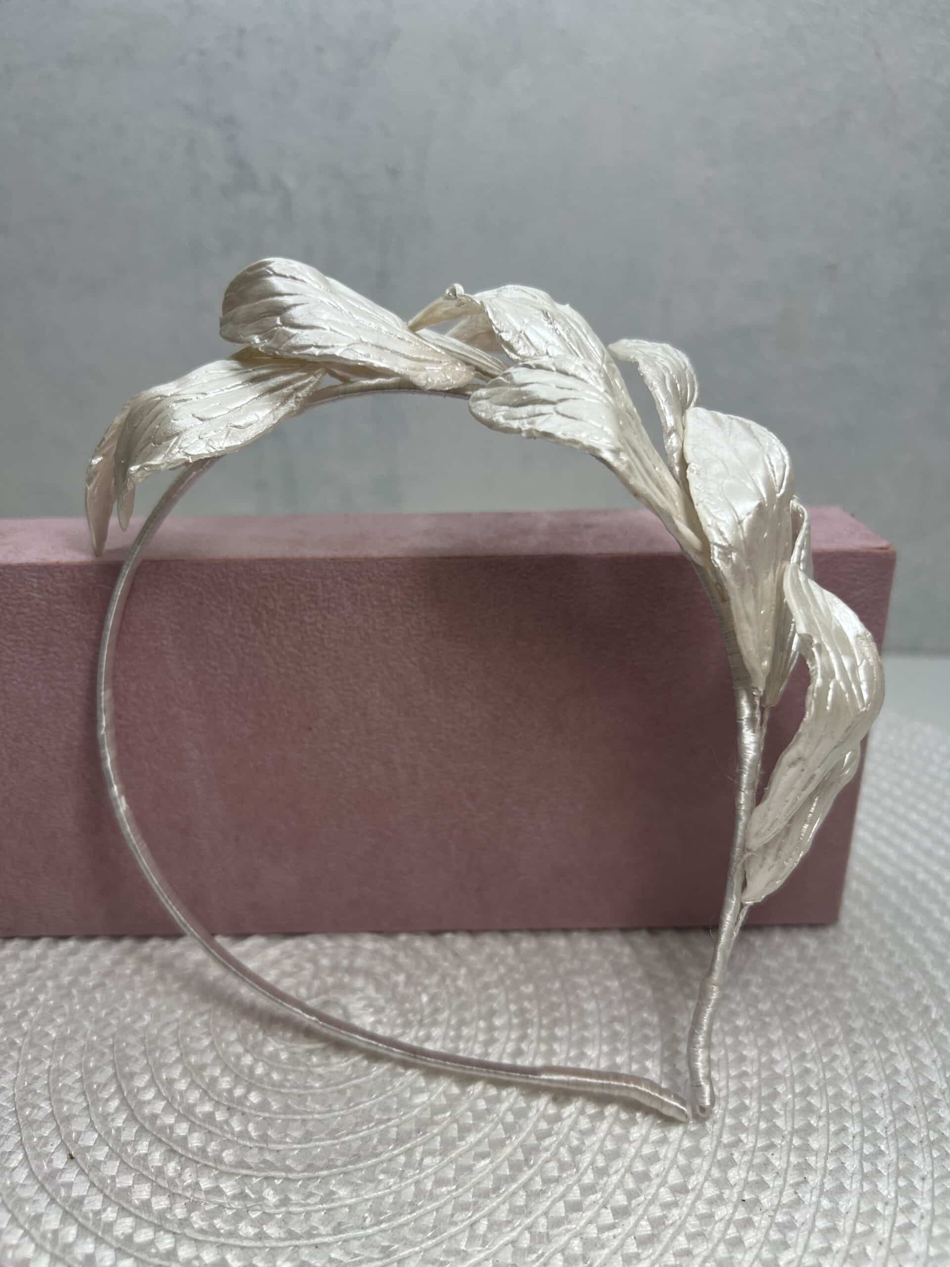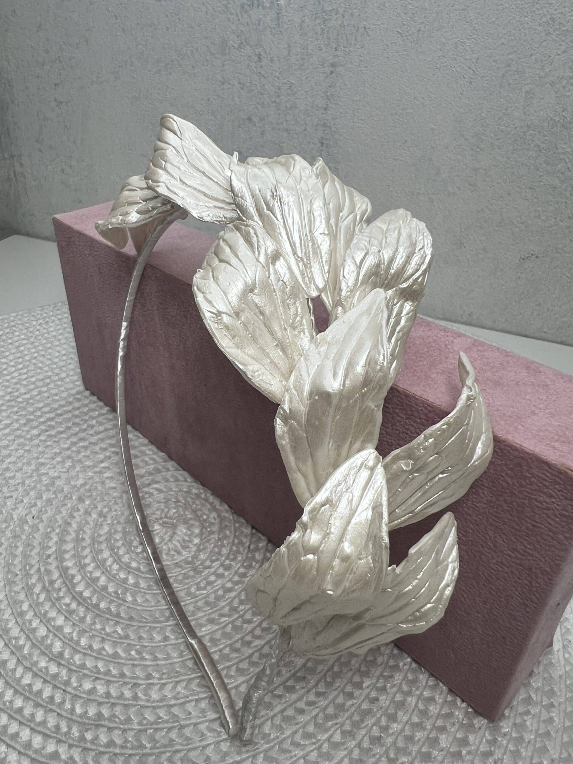 Diadema de hojas de porcelana blanca nacarada , todas sus hojas son hechas a mano y cada ramita forrada con hilo de seda blanco igual que la diadema de metal donde van colocadas una a una para formar un cojunto perfectamente integrado.